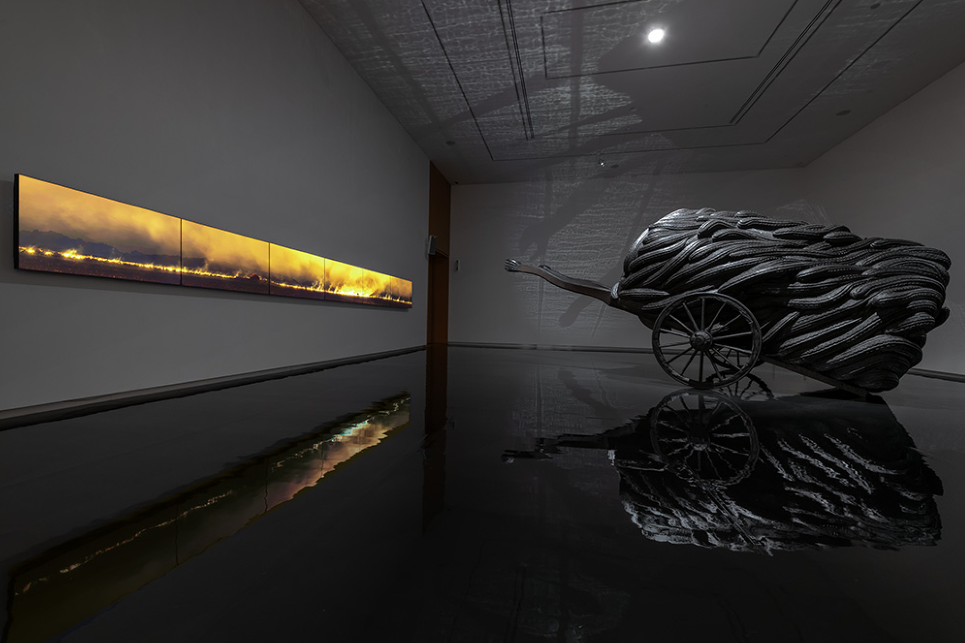 Wastelands: Wastelands – Brett Graham, Wastelands (installation view), 2024, wood, synthetic polymer paint, steel, found wagon wheels, macrocarpa wood, paint, oilbased acrylic lacquer, wax. Auckland Art Gallery Toi o Tāmaki, purchased with the assistance of the Patrons of the Auckland Art Gallery 2024