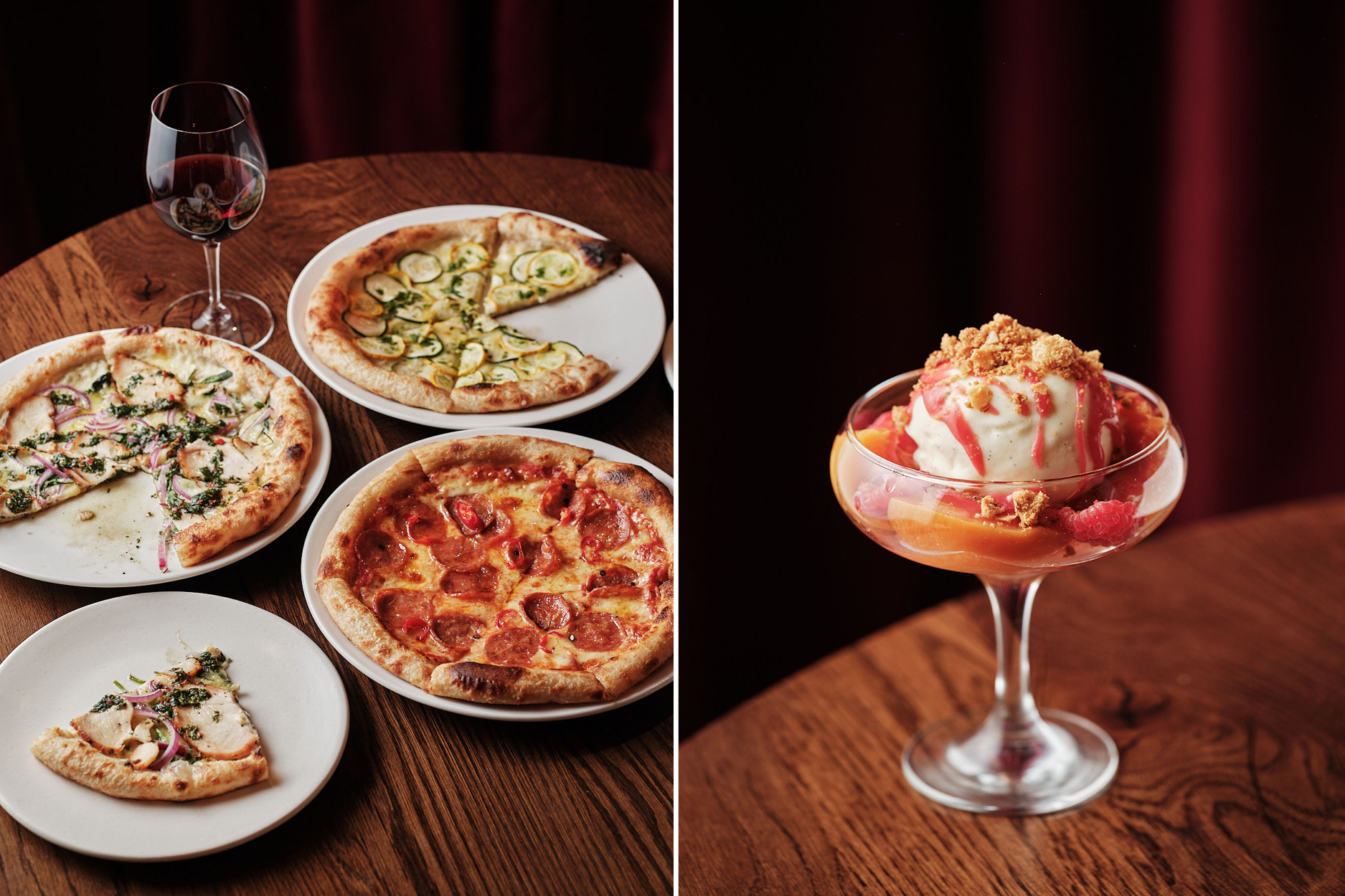 left: Somm’s selection of pizzas. Right: Peach melba