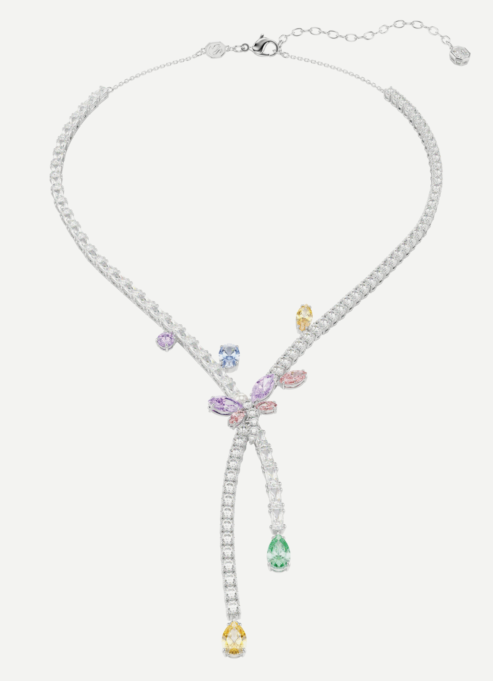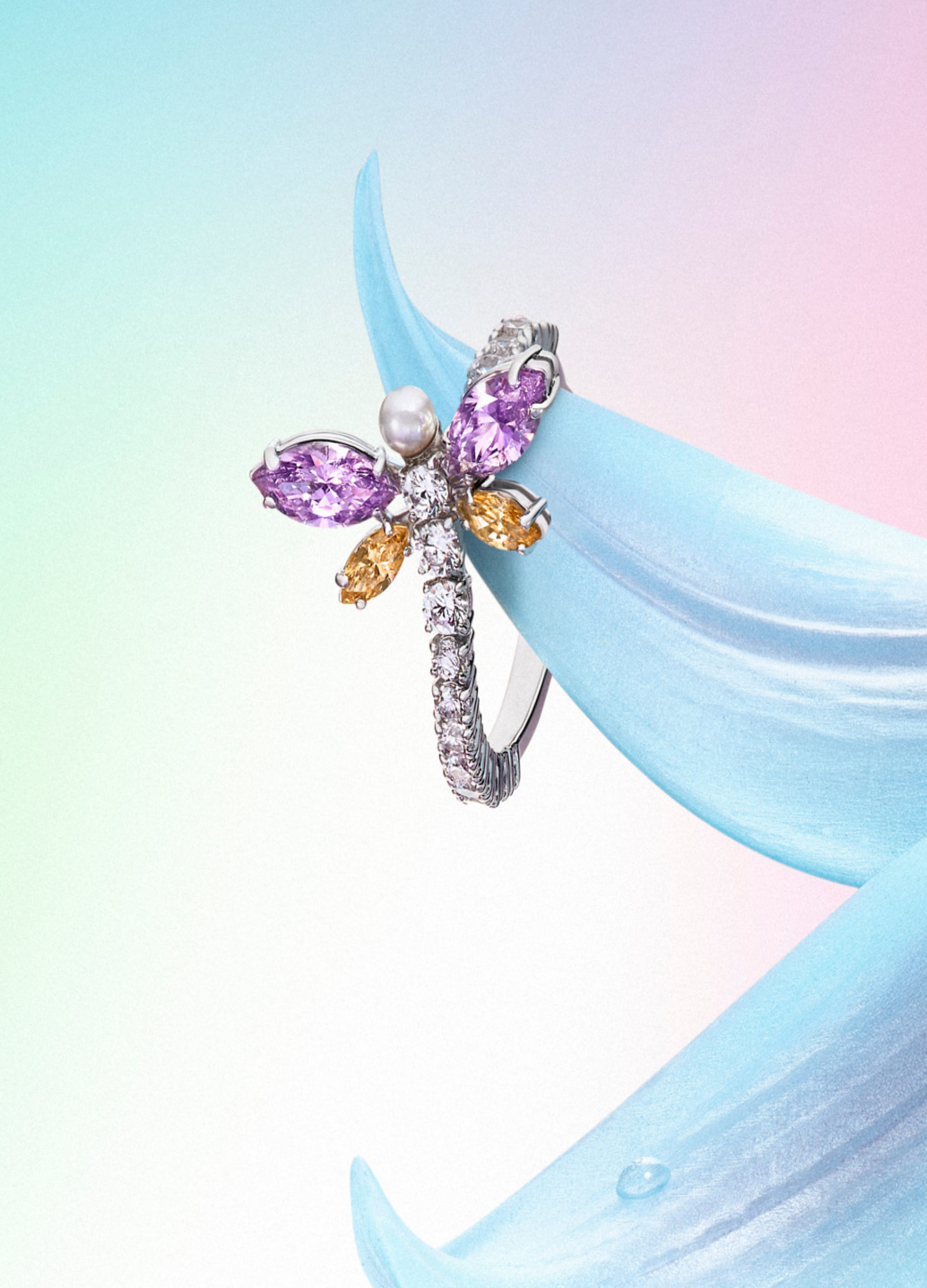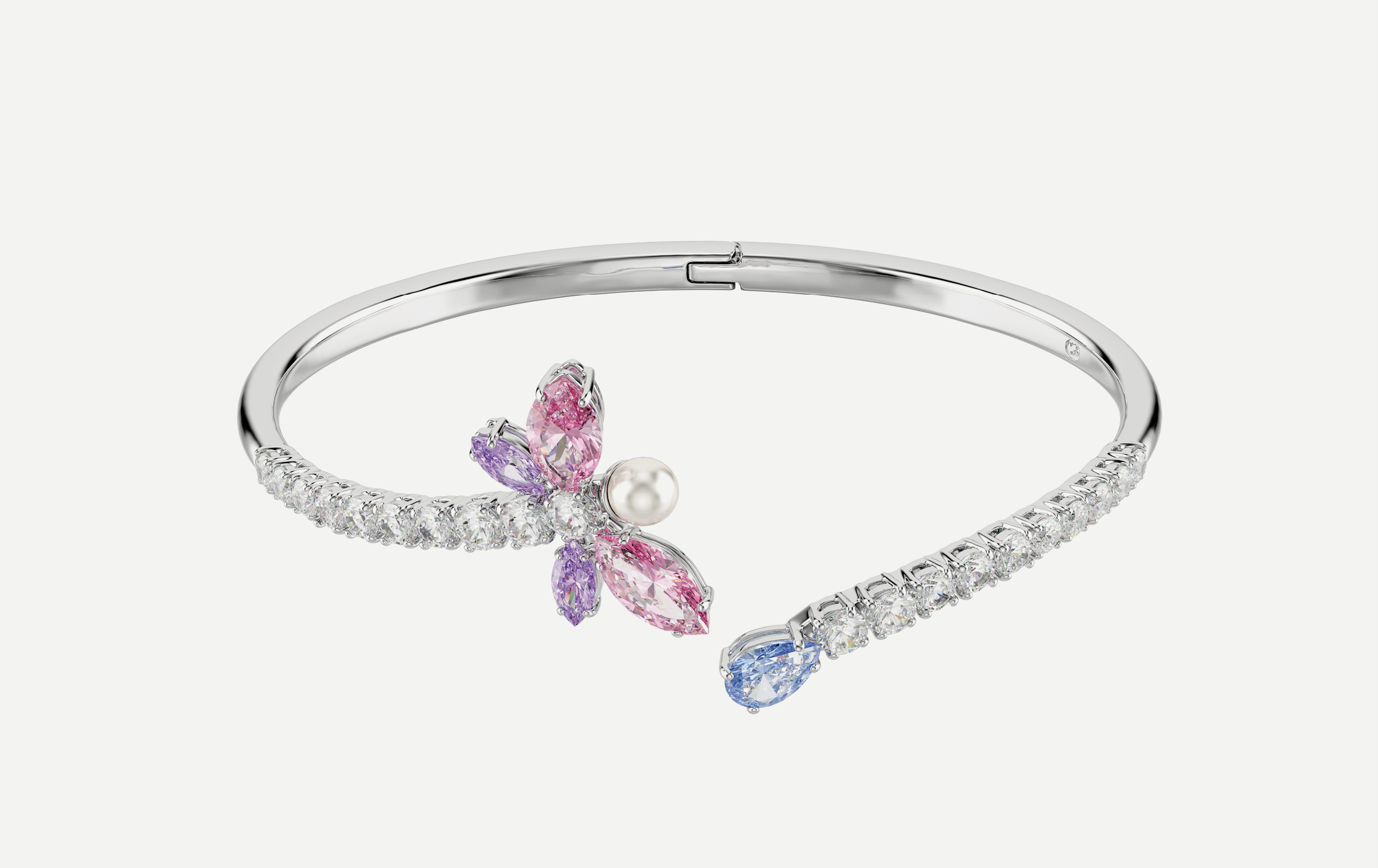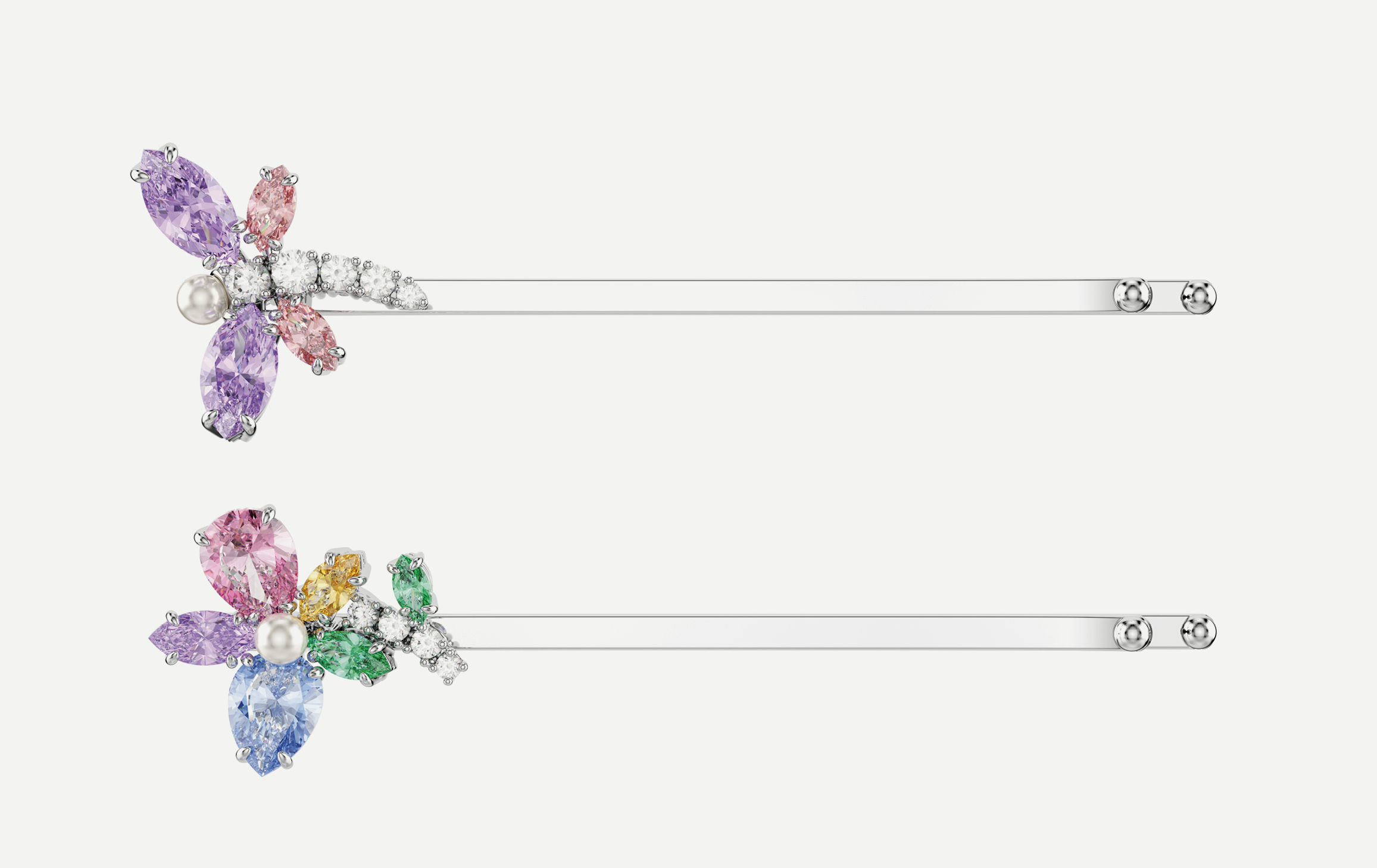 Elsewhere, crystal butterflies appear across brooches and hair accessories, while floral motifs bloom through necklaces and rings set with rainbow-hued stones and softly luminous crystal pearls. Mixed-metal settings allow the colours to shift and glow, creating an iridescent effect reminiscent of the Aurora Borealis.