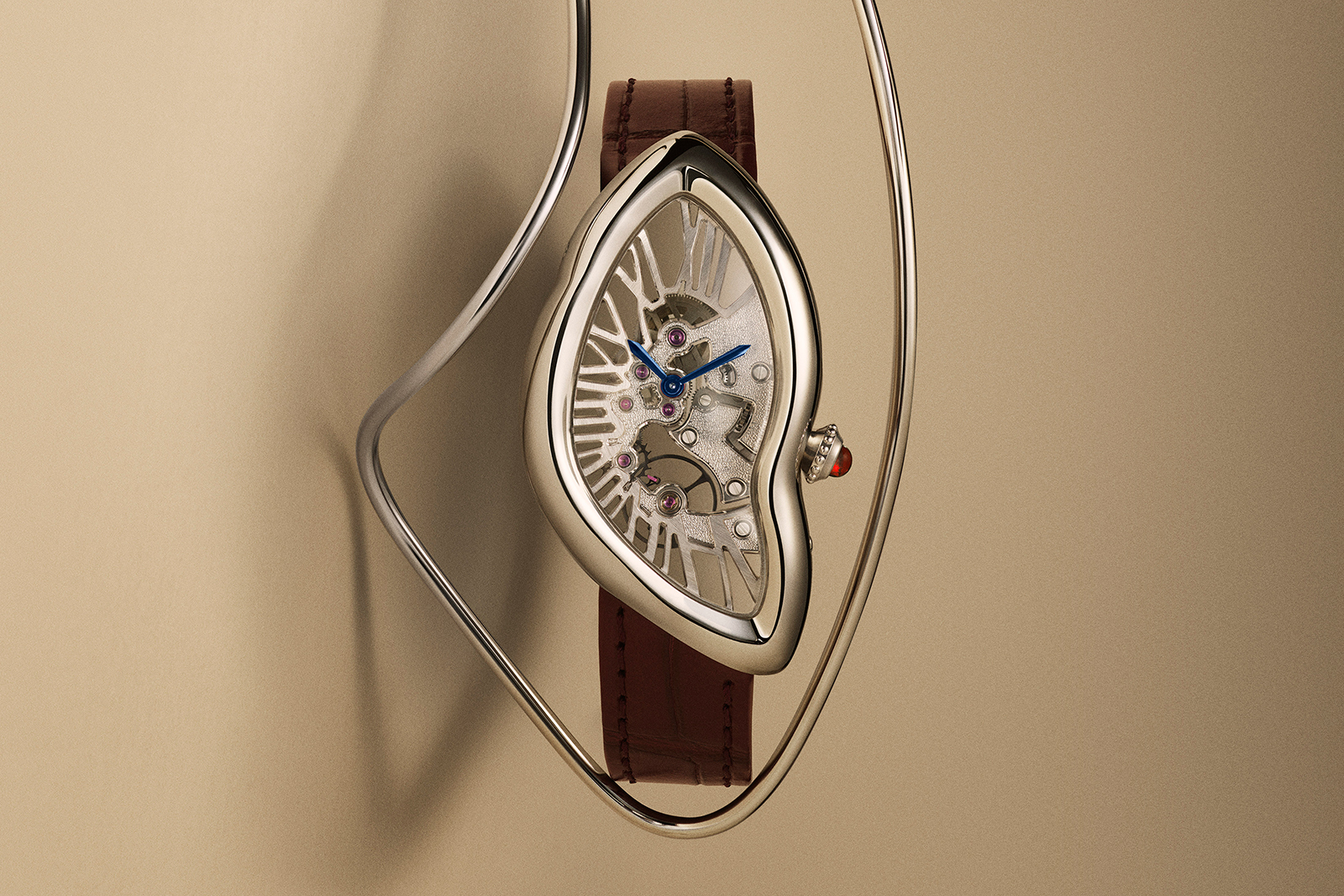 The Crash has been winning auctions and unsettling people in the best possible way since 1967, when a fire-damaged Baguette watch allegedly inspired its distorted case. The origin story may be partly apocryphal. The watch is real, and in skeleton form for the Privé Les Opus tenth edition, it becomes something that stretches the definition of what a dial can even be. The Manufacture 1967 MC movement is visible through the case, its bridges hand-hammered into the forms of Roman numerals, 142 components arranged within a shape that offers them none of the usual spatial courtesies. Platinum throughout, with burgundy on the strap, dial details and the ruby cabochon crown, a detail shared across all three Les Opus pieces this year. Limited to 150. The most technically involved Privé release to date, and the one everyone in Geneva was talking about. The tenth edition also returns the Tank Normale and the Tortue Chronographe Monopoussoir in platinum with the same burgundy accent, completing a trio that reads as a deliberate survey of Cartier’s formal vocabulary.