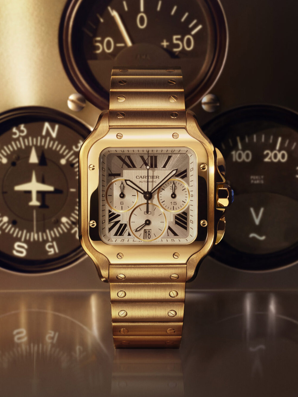 The Santos de Cartier Chronograph scales to 47.5 x 39.8mm with a reworked dial in alternating satin and sunray finishes, three subdials with gold or rhodium rings, and the automatic 1904-CH MC movement. Available in steel, two-tone and yellow gold, each with a second strap and both SmartLink and QuickSwitch systems. More instrument than icon, and the revised proportions make that distinction sharper.