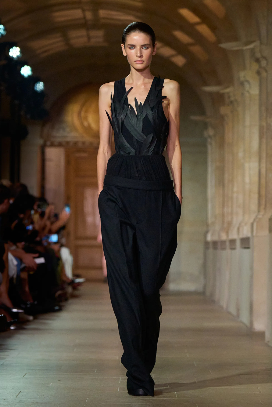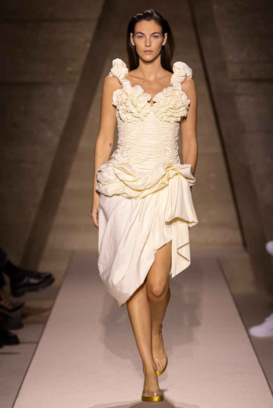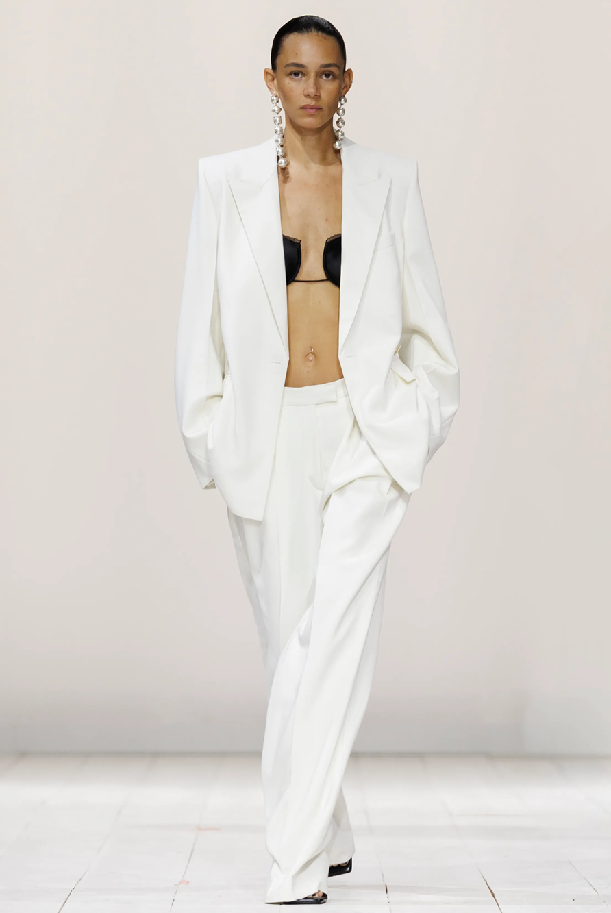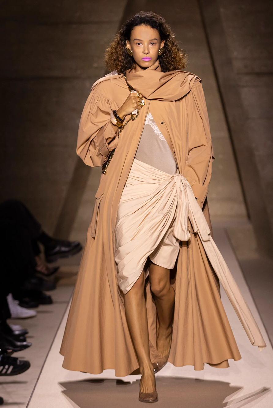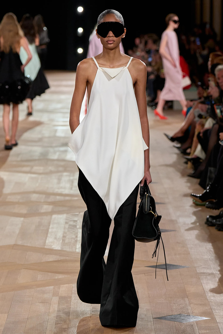 Givenchy and Schiaparelli embraced the barely there trend and leant all the way into the naked dress while others — think Miu Miu and Chemena Kamali’s Chloé — harped back to their respective brand DNA with the sixties’ shift and romantic ruching. The ateliers at Victoria Beckham, Celiné and Chanel approached menswear and casual suiting with the kind of ease of confidence that we’ve come to expect from all three, while Valentino and ALAÏA took a rose-tinted lens, cladding models in sequins, delicate lace appliqué and full plumage.