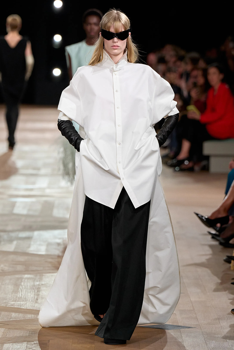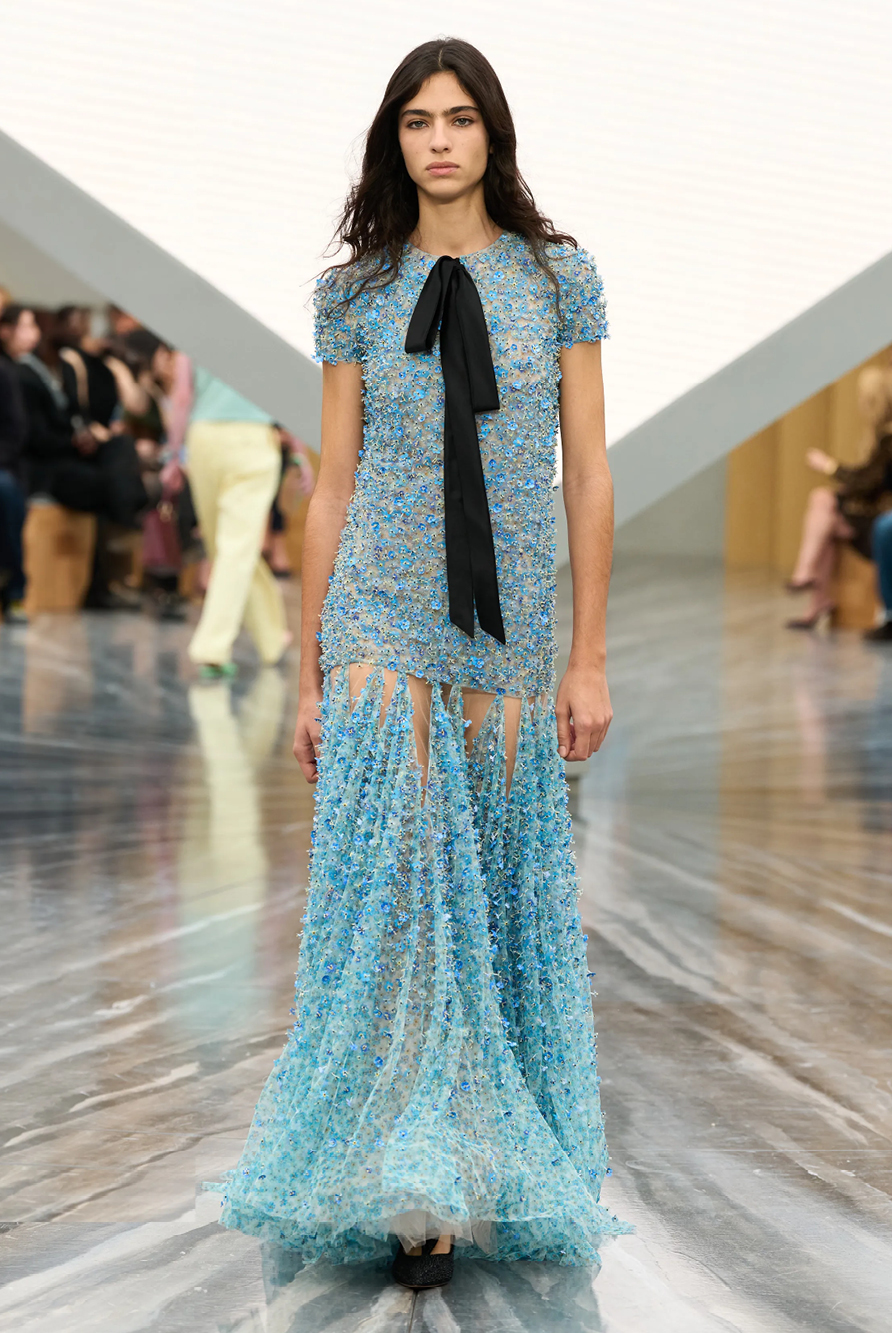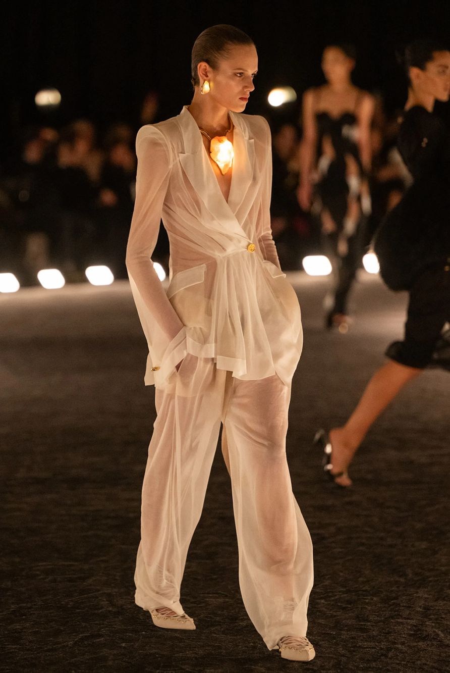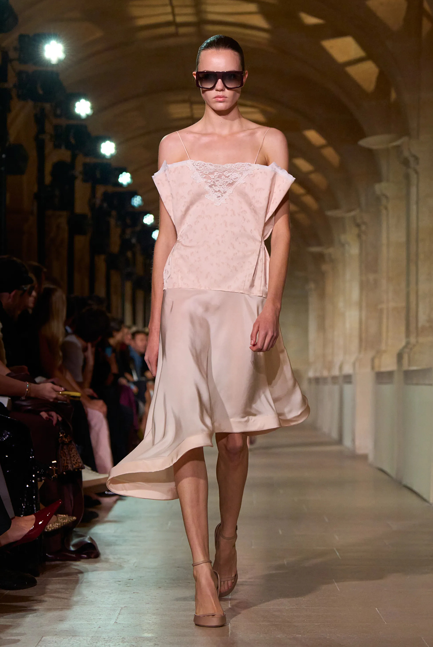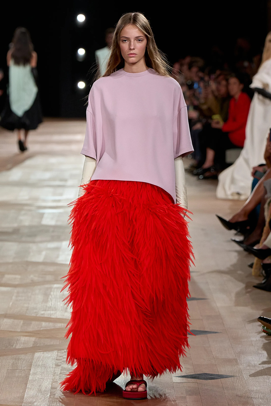 Givenchy and Schiaparelli embraced the barely there trend and leant all the way into the naked dress while others — think Miu Miu and Chemena Kamali’s Chloé — harped back to their respective brand DNA with the sixties’ shift and romantic ruching. The ateliers at Victoria Beckham, Celiné and Chanel approached menswear and casual suiting with the kind of ease of confidence that we’ve come to expect from all three, while Valentino and ALAÏA took a rose-tinted lens, cladding models in sequins, delicate lace appliqué and full plumage.