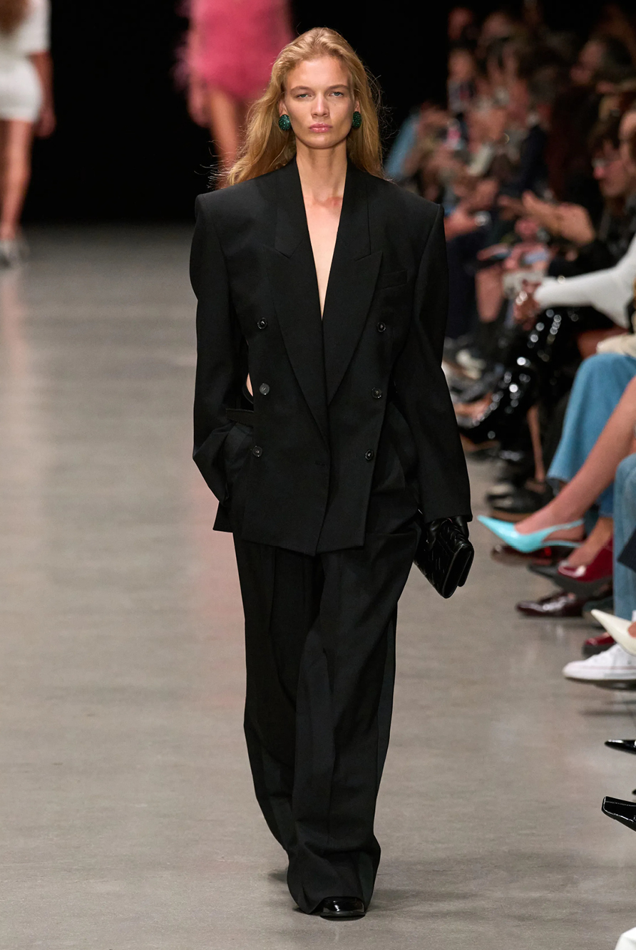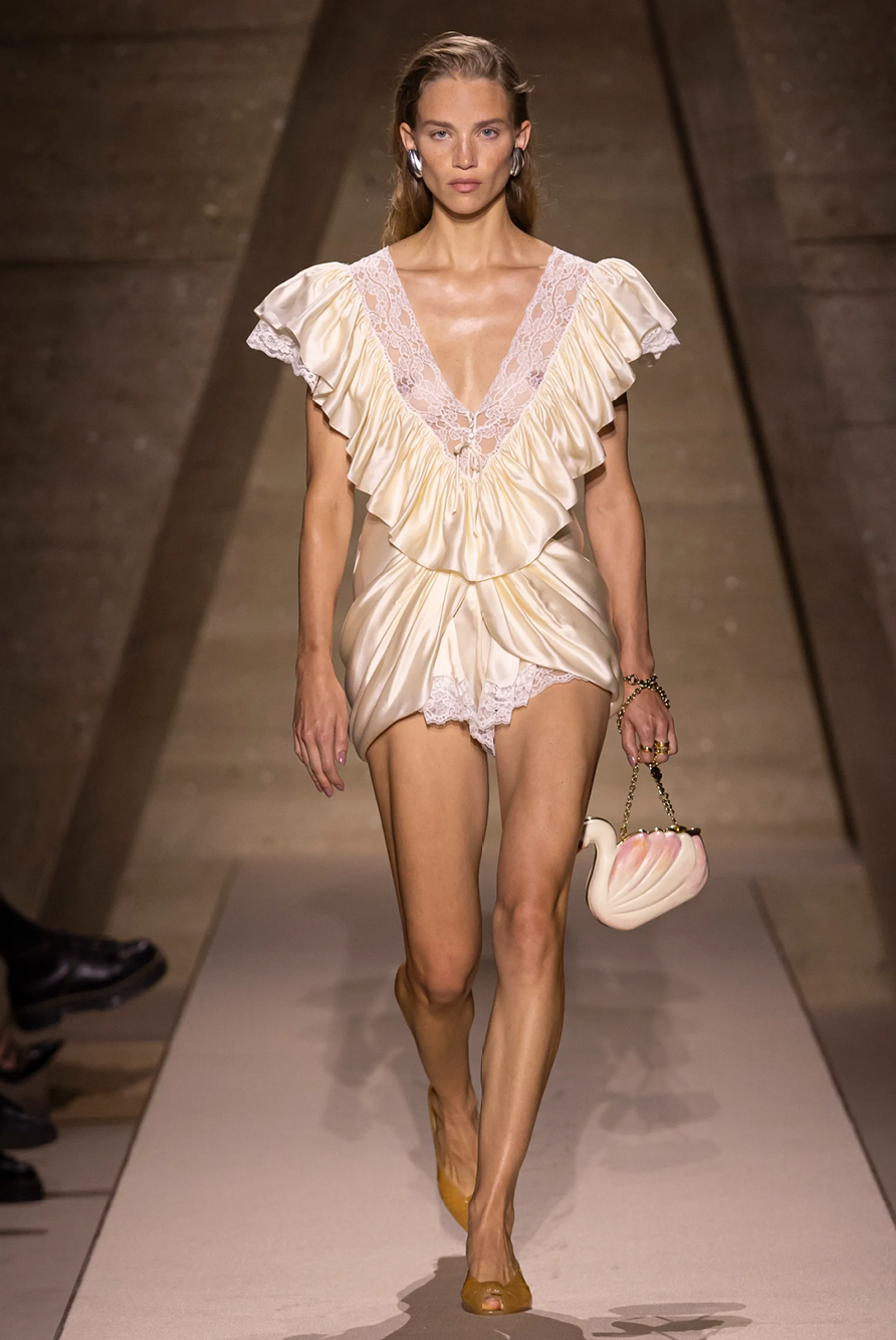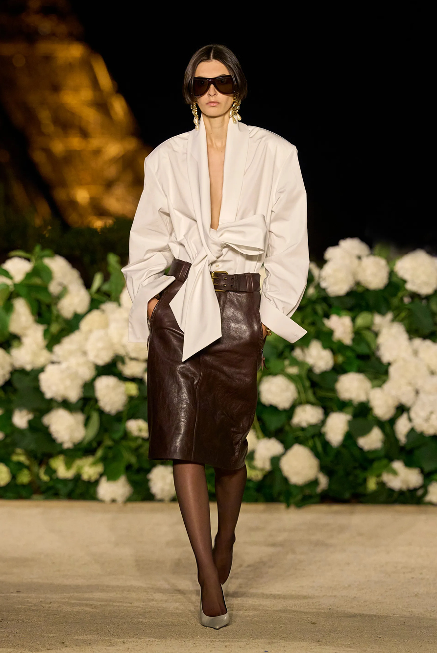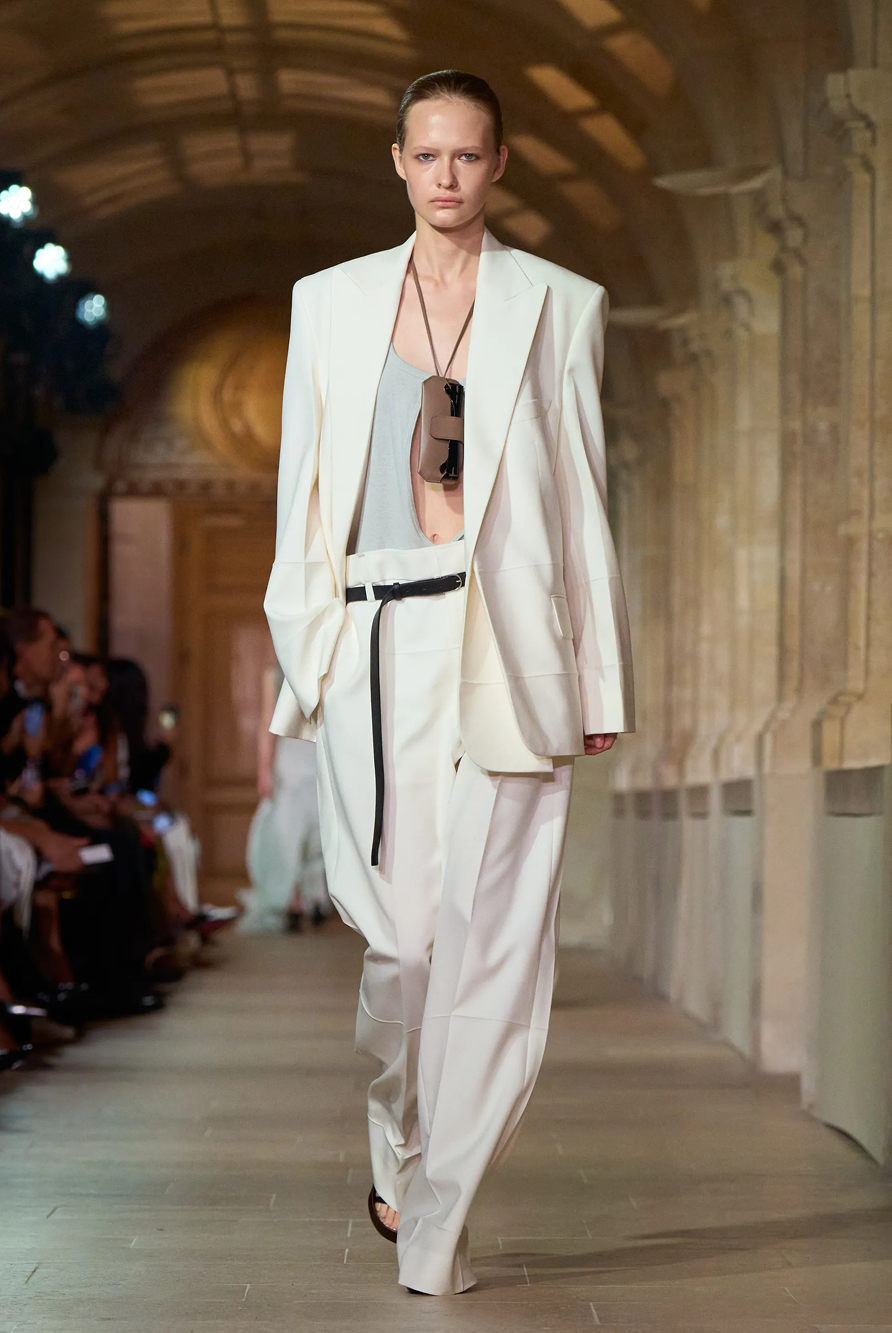 Givenchy and Schiaparelli embraced the barely there trend and leant all the way into the naked dress while others — think Miu Miu and Chemena Kamali’s Chloé — harped back to their respective brand DNA with the sixties’ shift and romantic ruching. The ateliers at Victoria Beckham, Celiné and Chanel approached menswear and casual suiting with the kind of ease of confidence that we’ve come to expect from all three, while Valentino and ALAÏA took a rose-tinted lens, cladding models in sequins, delicate lace appliqué and full plumage.