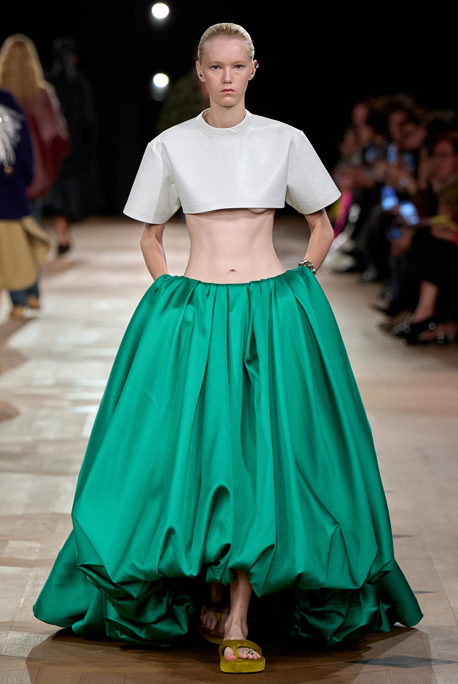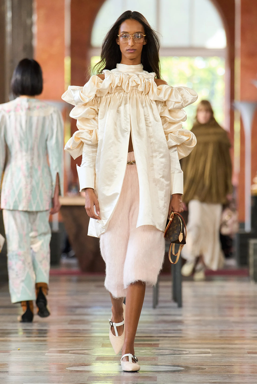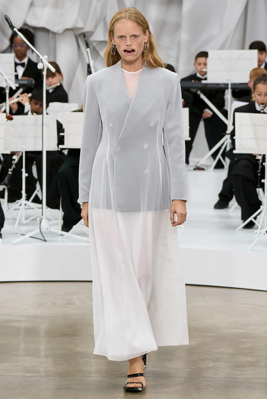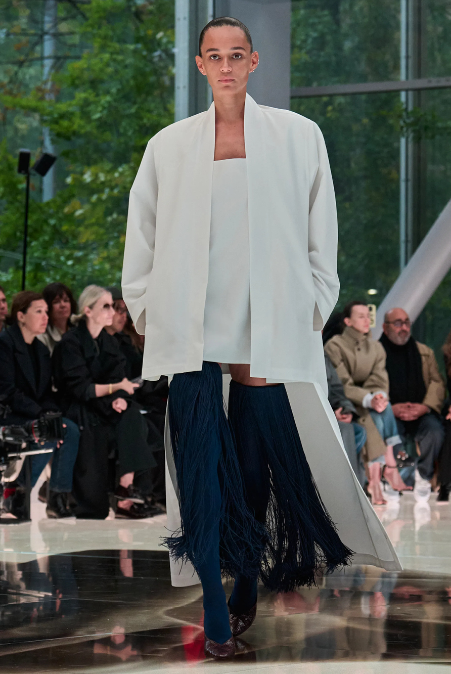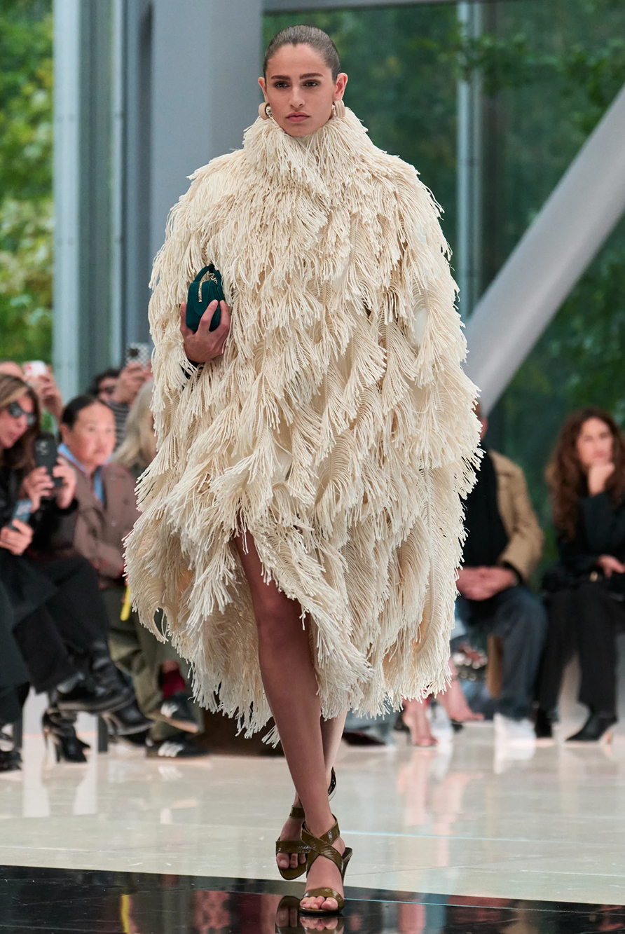 Givenchy and Schiaparelli embraced the barely there trend and leant all the way into the naked dress while others — think Miu Miu and Chemena Kamali’s Chloé — harped back to their respective brand DNA with the sixties’ shift and romantic ruching. The ateliers at Victoria Beckham, Celiné and Chanel approached menswear and casual suiting with the kind of ease of confidence that we’ve come to expect from all three, while Valentino and ALAÏA took a rose-tinted lens, cladding models in sequins, delicate lace appliqué and full plumage.