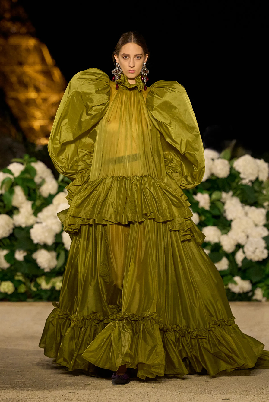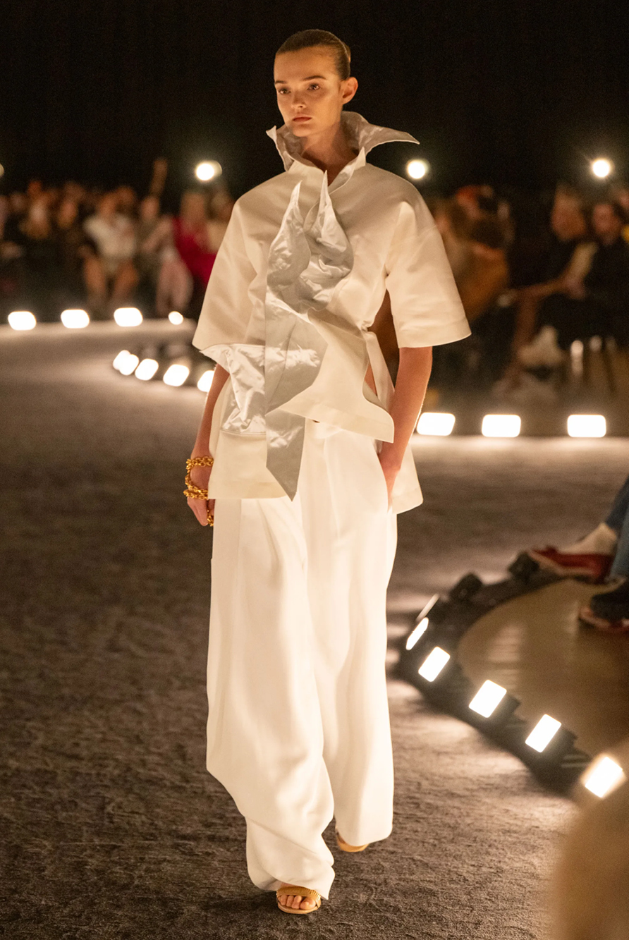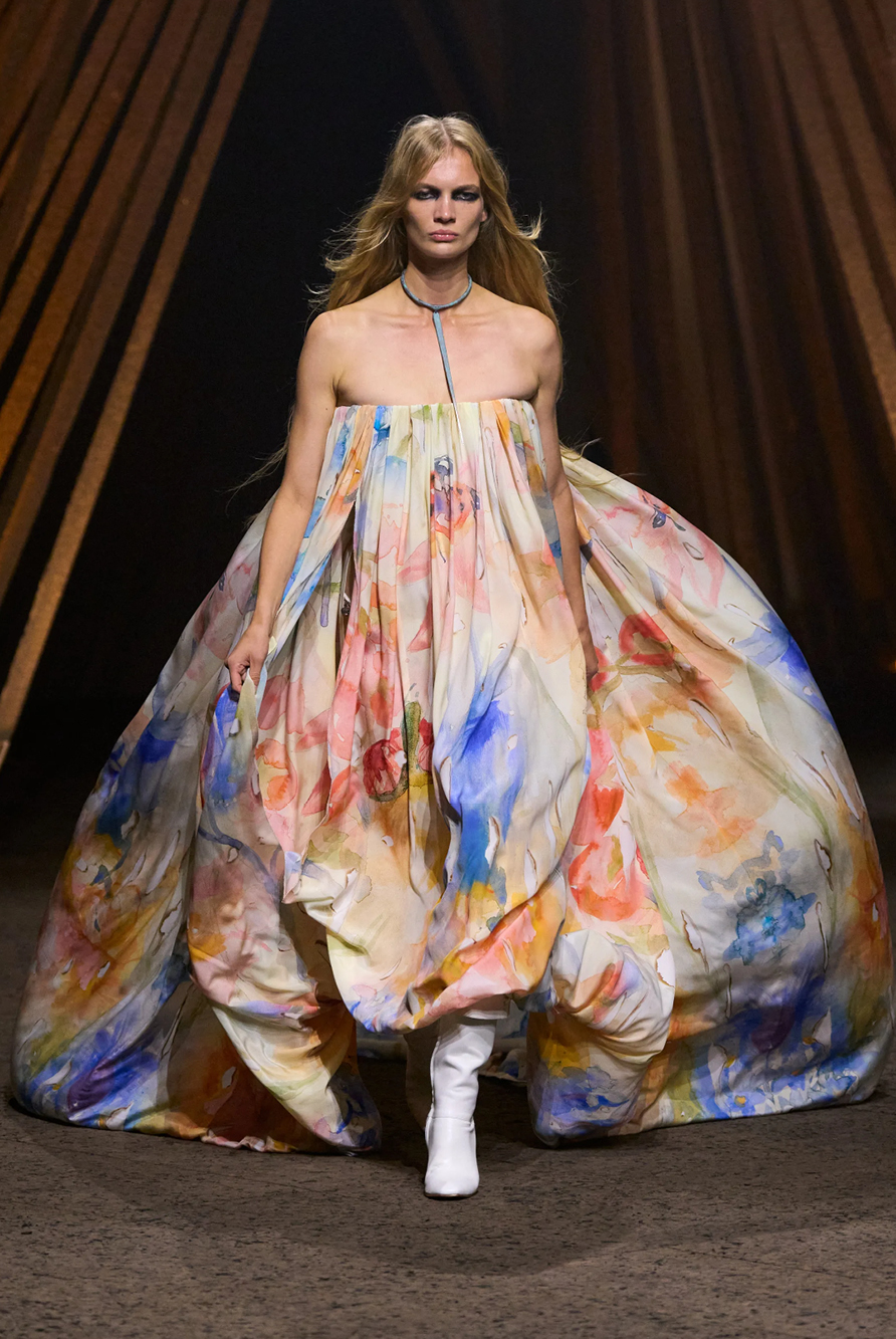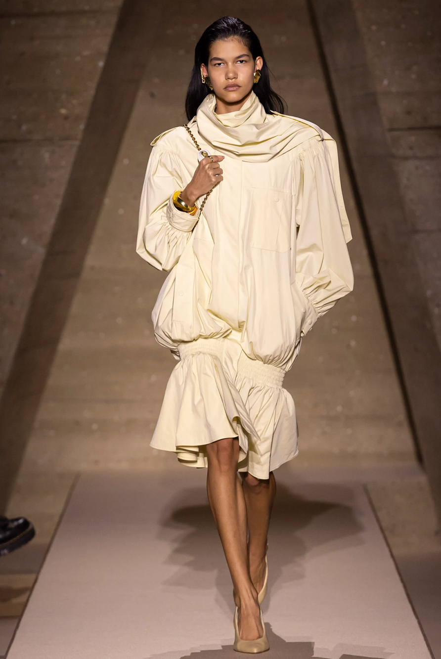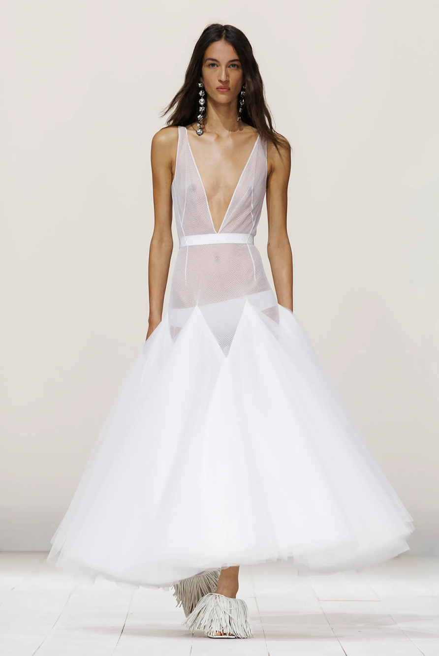Givenchy and Schiaparelli embraced the barely there trend and leant all the way into the naked dress while others — think Miu Miu and Chemena Kamali’s Chloé — harped back to their respective brand DNA with the sixties’ shift and romantic ruching. The ateliers at Victoria Beckham, Celiné and Chanel approached menswear and casual suiting with the kind of ease of confidence that we’ve come to expect from all three, while Valentino and ALAÏA took a rose-tinted lens, cladding models in sequins, delicate lace appliqué and full plumage.