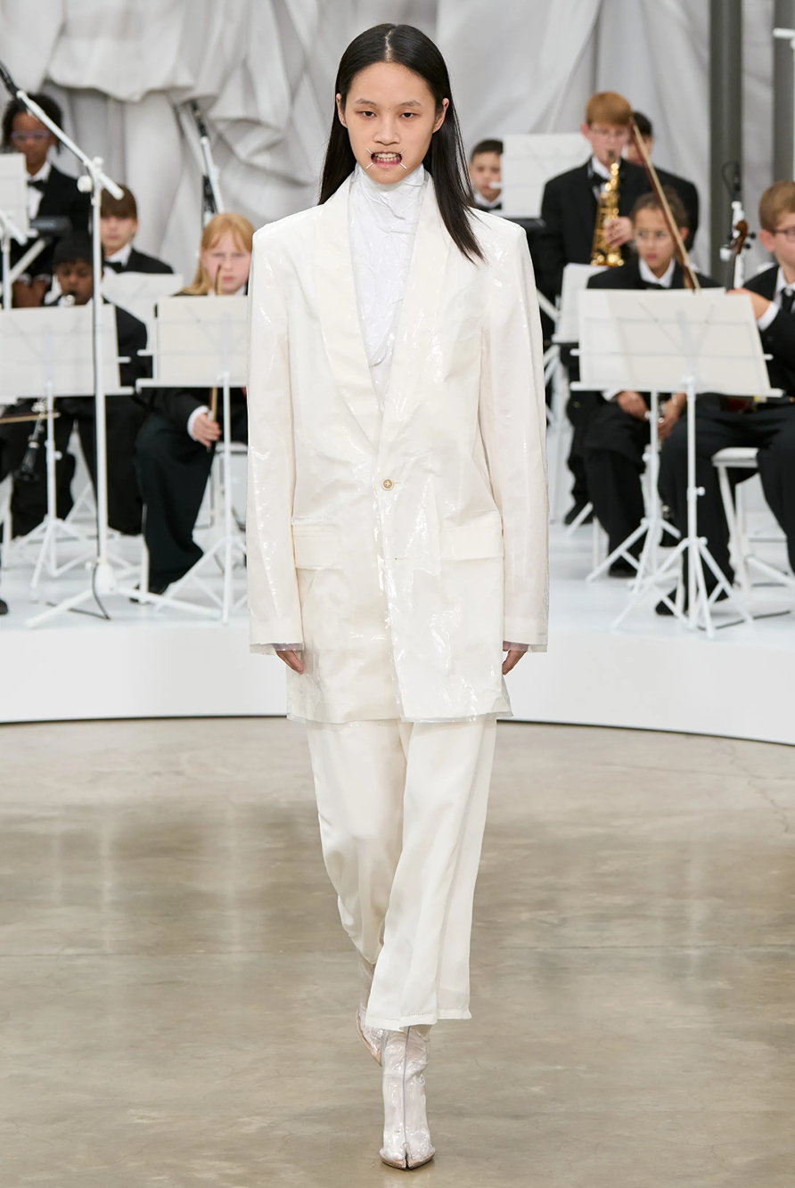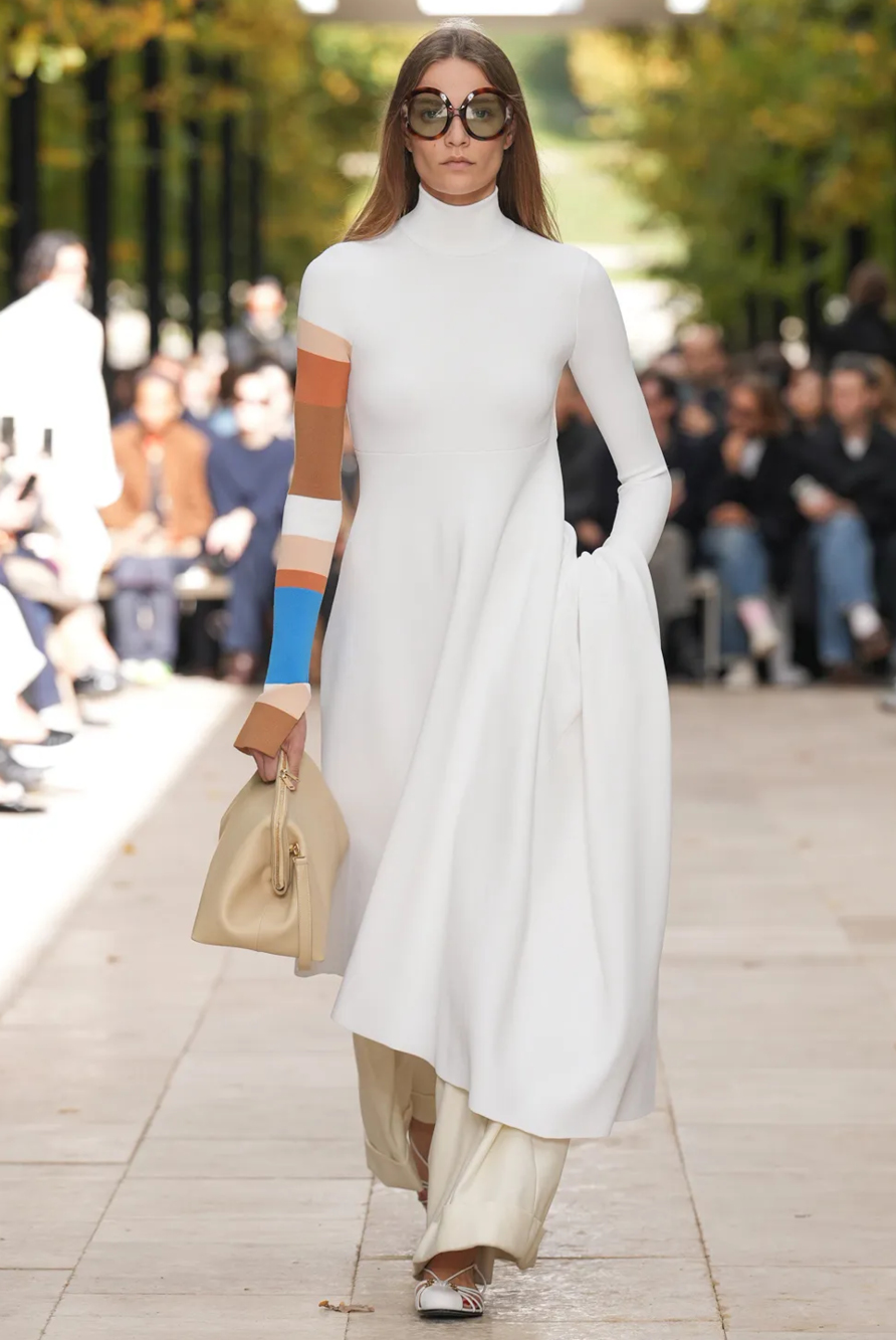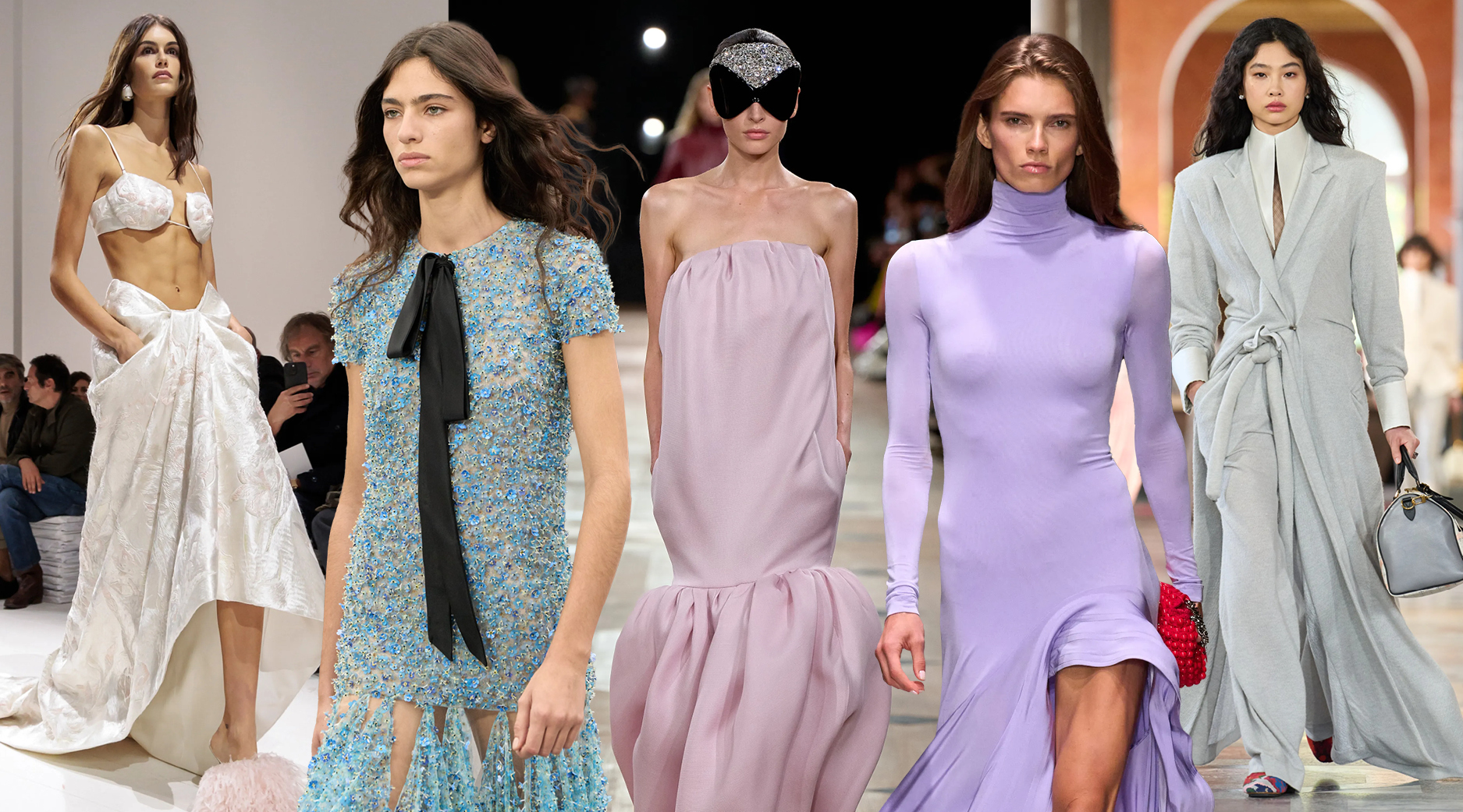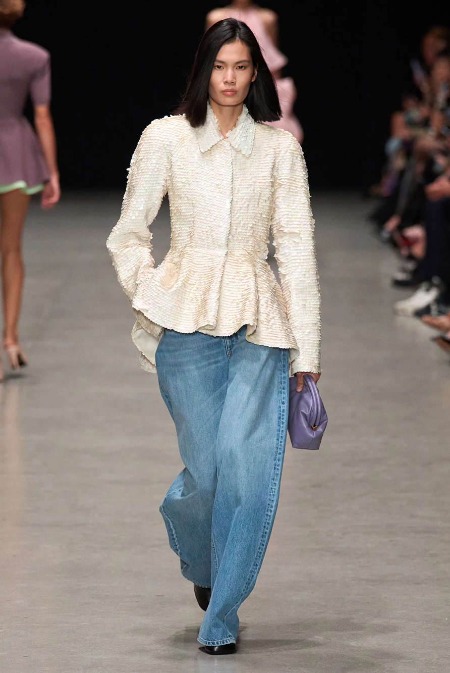 Givenchy and Schiaparelli embraced the barely there trend and leant all the way into the naked dress while others — think Miu Miu and Chemena Kamali’s Chloé — harped back to their respective brand DNA with the sixties’ shift and romantic ruching. The ateliers at Victoria Beckham, Celiné and Chanel approached menswear and casual suiting with the kind of ease of confidence that we’ve come to expect from all three, while Valentino and ALAÏA took a rose-tinted lens, cladding models in sequins, delicate lace appliqué and full plumage.