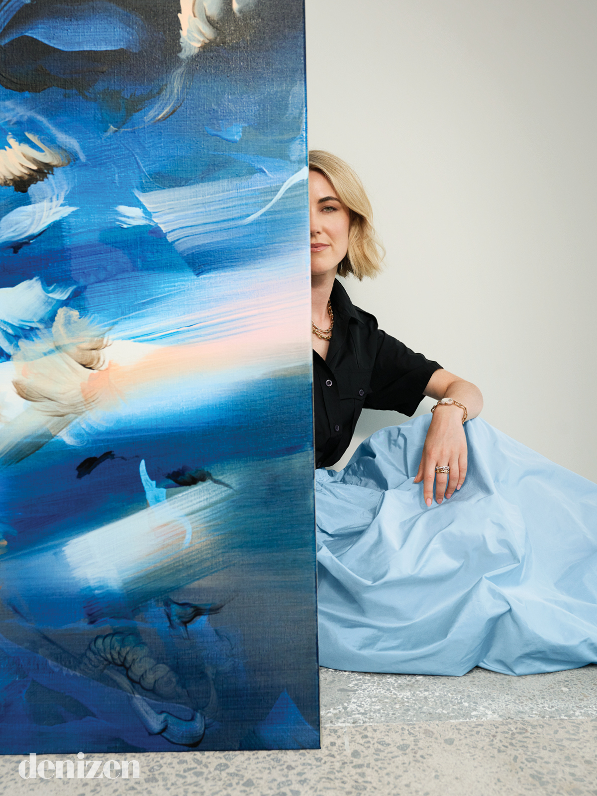 Rhythm sits at the centre of how Wright enters that state. Before painting became the primary language of her practice, she spent years immersed in music, studying piano, playing bass guitar and composing orchestral arrangements during her school years. Those experiences shaped how she understands structure and movement. “When I listen to orchestral music now, I can hear how the different parts move together,” she says. “You’ve got these melodies and rhythms layering over one another to create an atmosphere. That’s very similar to how the paintings develop.” The connection is not metaphorical. Music accompanies sessions in her studio. Wright gravitates towards cinematic scores whose expansive emotional landscapes shape the tempo of her work. Pieces from films such as Interstellar or Oppenheimer create an atmosphere in which gestures begin to unfold almost choreographically. “The music changes how I move,” she says. “Sometimes the brush turns slowly, and the gesture unwinds across the canvas. Other times, the movements are faster.”