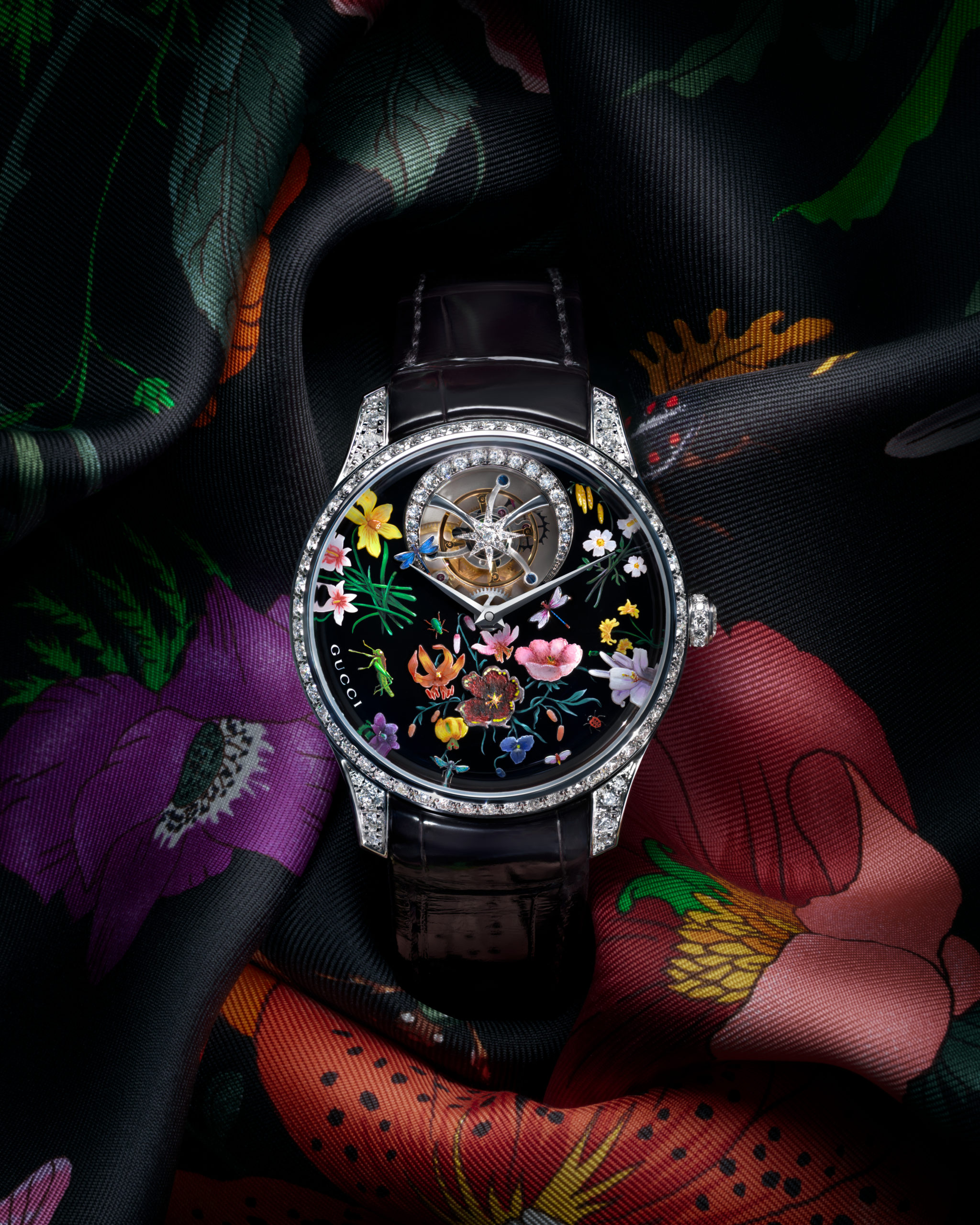 Vittorio Accornero created the Flora print for Gucci in 1966, originally as a silk scarf for Grace Kelly. Sixty years later, it becomes the subject of a white gold tourbillon featuring micro-painting, hand engraving, and individually set minerals to recreate its fluid botanicals on an onyx dial base. Pink opal, blood jasper and mother-of-pearl are each inlaid separately, refined by laser and finished by hand. The case carries miniature white gold creatures, a grasshopper and a dragonfly, rendered with fine engraving and micro-painting at a scale that makes you pause and think about the people who do this work, and what their eyesight is like by Friday afternoon. Viewing it in person at Gucci’s offsite presentation at The Woodward Hotel, the exacting detail has to be seen. A diamond-set case, a diamond-set tourbillon at twelve, and sixty years of history compressed into something you can wear on your wrist.