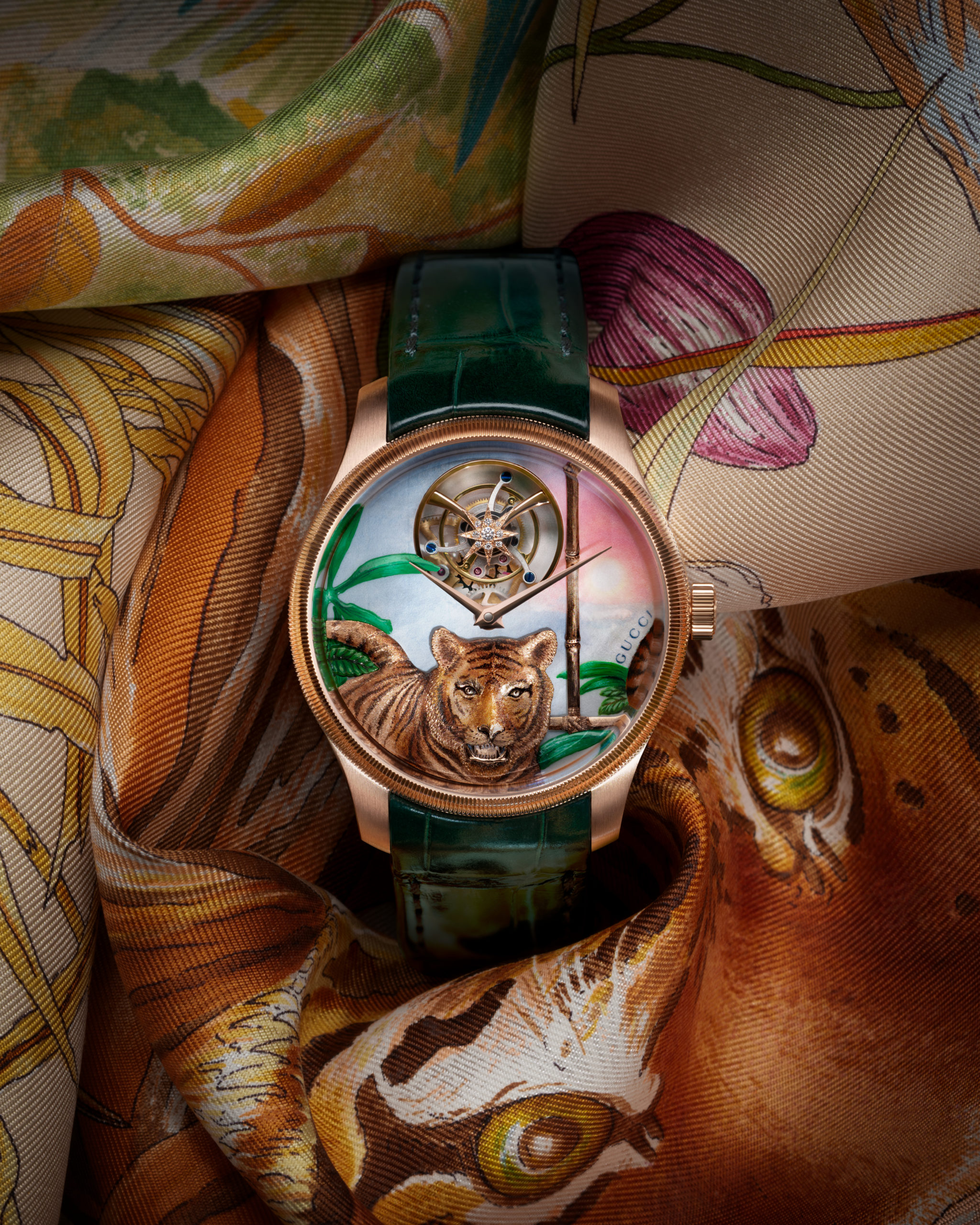 The fourth Métiers d’Art watch draws on Gucci’s Animalia scarf prints from the late 1970s, placing a hand-painted rose gold tiger against a mother-of-pearl dial, where micro-painting evokes a blazing sun dissolving into haze beneath the surface. The natural iridescence of the mother-of-pearl becomes part of the composition rather than a neutral background, and the effect in person is more alive than any of my photographs or videos have managed to convey. A hand-engraved bamboo accent in rose gold, a callback to the house’s archive, and a diamond-set star on the tourbillon at twelve. The most structurally unified of the four, with every element returning to a Gucci reference, and the one I found myself returning to most.