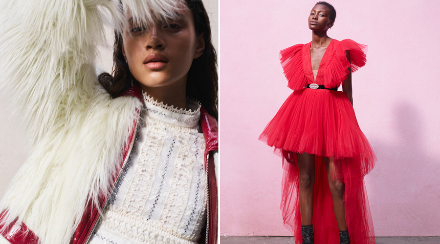 It’s always hard to choose, but my heart does beat a little faster for the maxi-length black floral tulle dress with the jewelled neckline, ruffled details and poet sleeves. I also love the black lace A-line dress with short sleeves, floral embroidery and ruffle hem, and the combination of the red leather trousers and red ruffled silk blouse is just absolutely stunning.