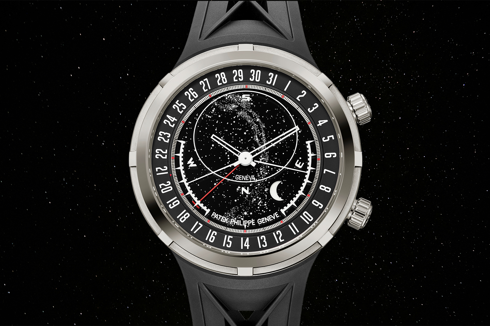A wristwatch that displays the times of sunrise and sunset for Geneva, with a patented movement that corrects both indications automatically when the clocks change. In a 47mm white gold case charting the night sky above the city, it stops you mid-stride. A complication that is, in the most literal sense, about how the day begins and ends. Patek’s most poetic technical statement in years.