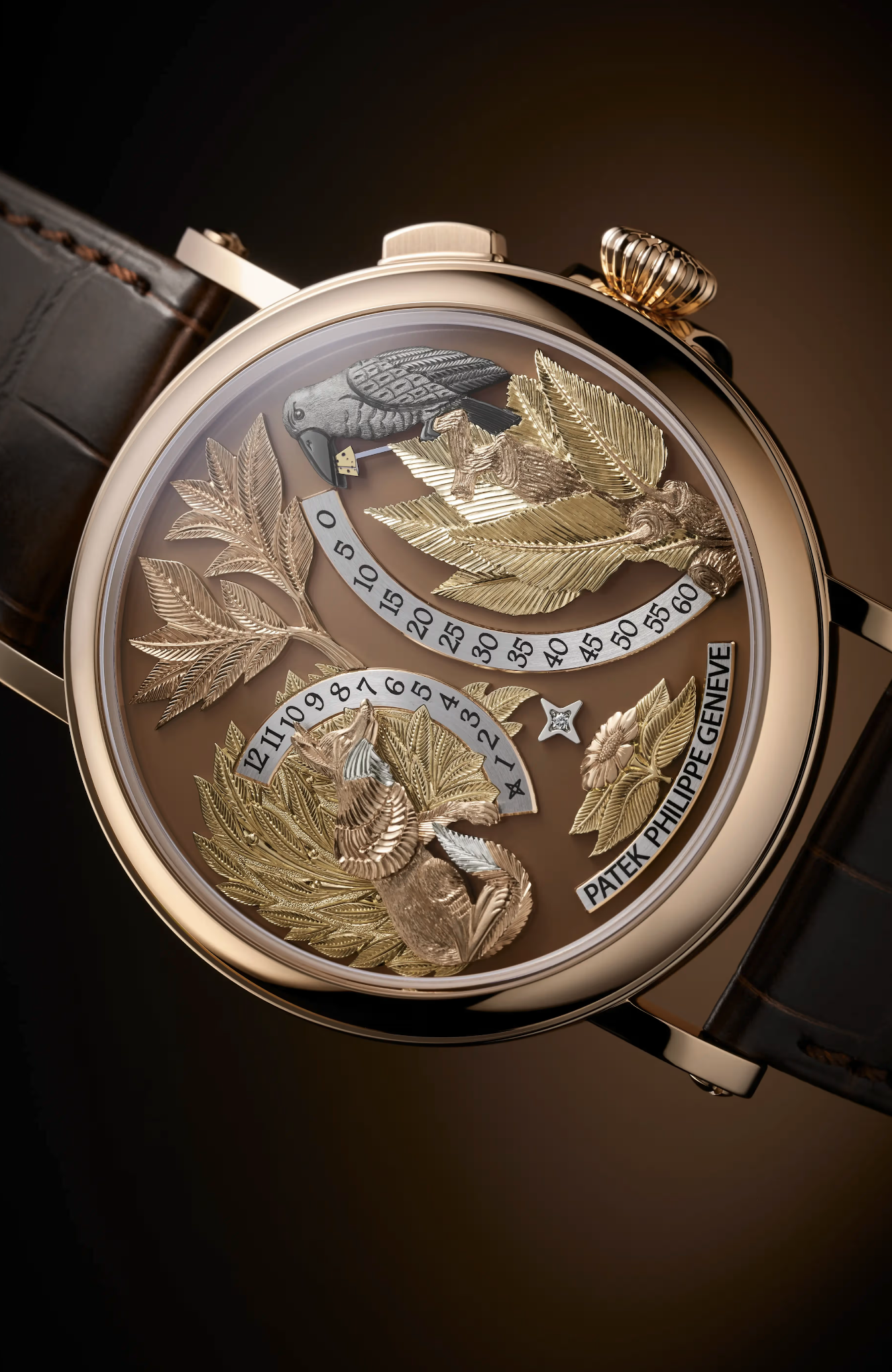 Drawn from La Fontaine’s fable of a crow flattered into dropping his cheese by a fox of considerable cunning, and from a 1958 pocket watch held in the Patek Philippe Museum, this is the brand’s first automaton wristwatch in modern history. Hours and minutes are displayed on demand, the scene animating beneath a rich brown opaline dial in a rose gold case. A fable about the consequences of vanity, rendered as one of the most covetable objects in the room.