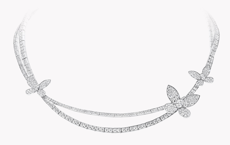 The collection showcases the Maison’s unmistakable mastery of diamonds. Brilliant and marquise-cut stones are meticulously arranged to capture the delicate symmetry of a butterfly in motion. Some pieces are defined by pavé-set diamonds that shimmer with every gesture, while others feature a single, perfectly proportioned stone at the centre, radiating quiet confidence and elegance.