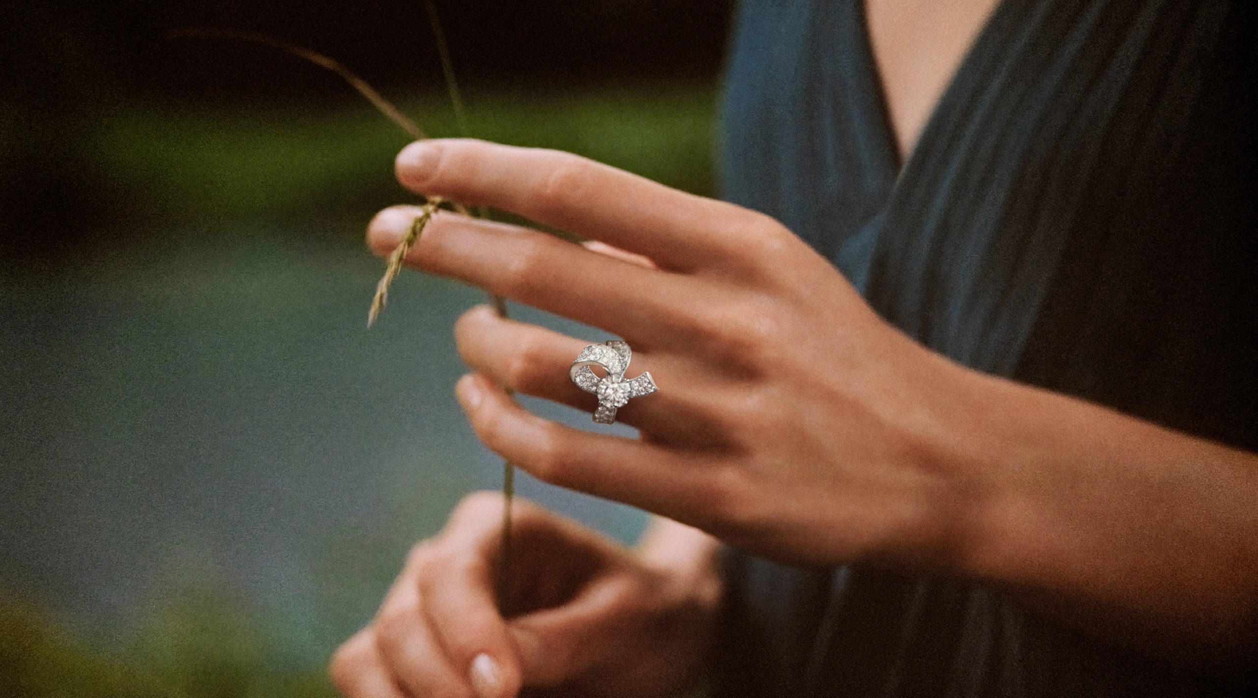 The Boucle solitaire forms a ribbon of light, its asymmetrical curves evoking the suppleness of fabric freshly tied. Pavé diamonds trace a fluid swirl around the finger, creating a delicate interplay of brilliance and shadow. Negative space is used with intention, enhancing movement and allowing light to travel through the setting. At its centre, a diamond secured by four prongs appears anchored beneath a sculpted bow, its radiance intensified by meticulous openwork.
