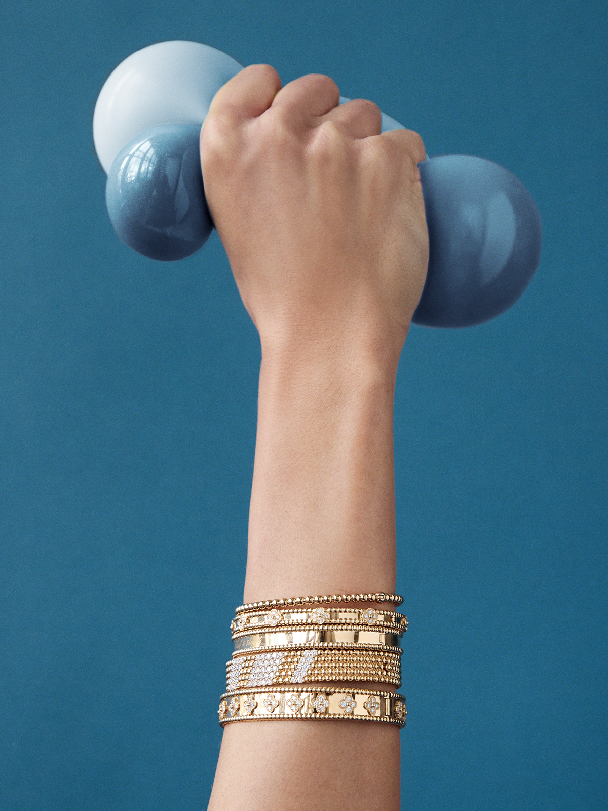 Van Cleef & Arpels Perlée clovers pendant, Perlée pearls of gold ring, Perlée diamonds ring, Perlée diamonds ring, Perlée Toi & Moi secret watch, Perlée couleurs ring. Entourage Gown from Common Hours.