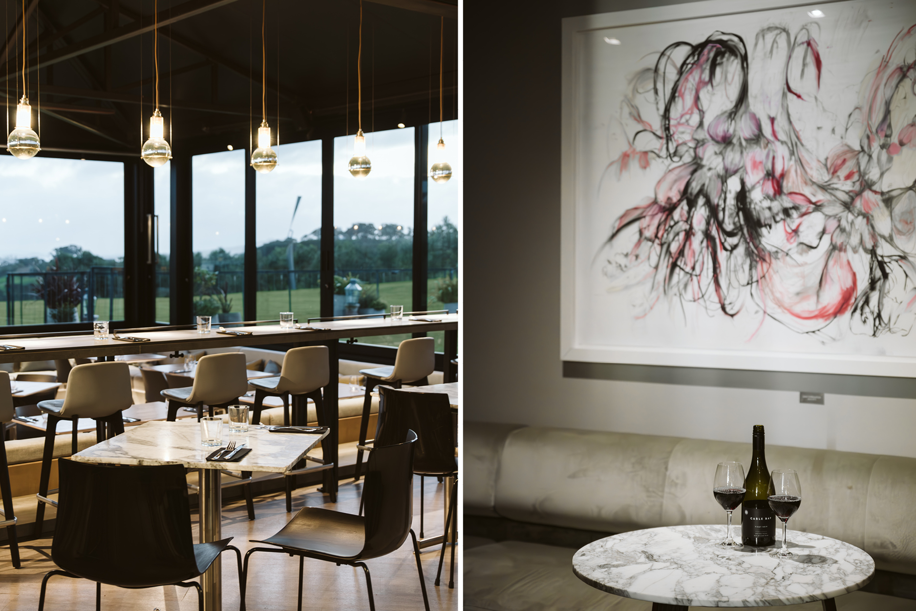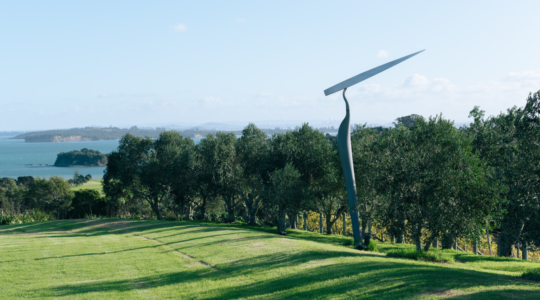 Cable Bay’s modernist glass-fronted pavilion — a celebrated design by Fearon Hay Architects — offers sweeping, uninterrupted views across the water. Light floods through the space, blurring the line between indoors and out, creating an atmosphere that feels open, elegant, and free. Step outside and the experience unfolds across rolling lawns, sculptural installations, and the surrounding vineyards. Works by leading New Zealand artists, including Phil Price, Virginia King, Anton Forde, and Konstantin Dimopoulos, are thoughtfully placed throughout the estate. As you wander with a glass in hand, these pieces reveal themselves one by one, turning a simple walk into a quiet discovery.