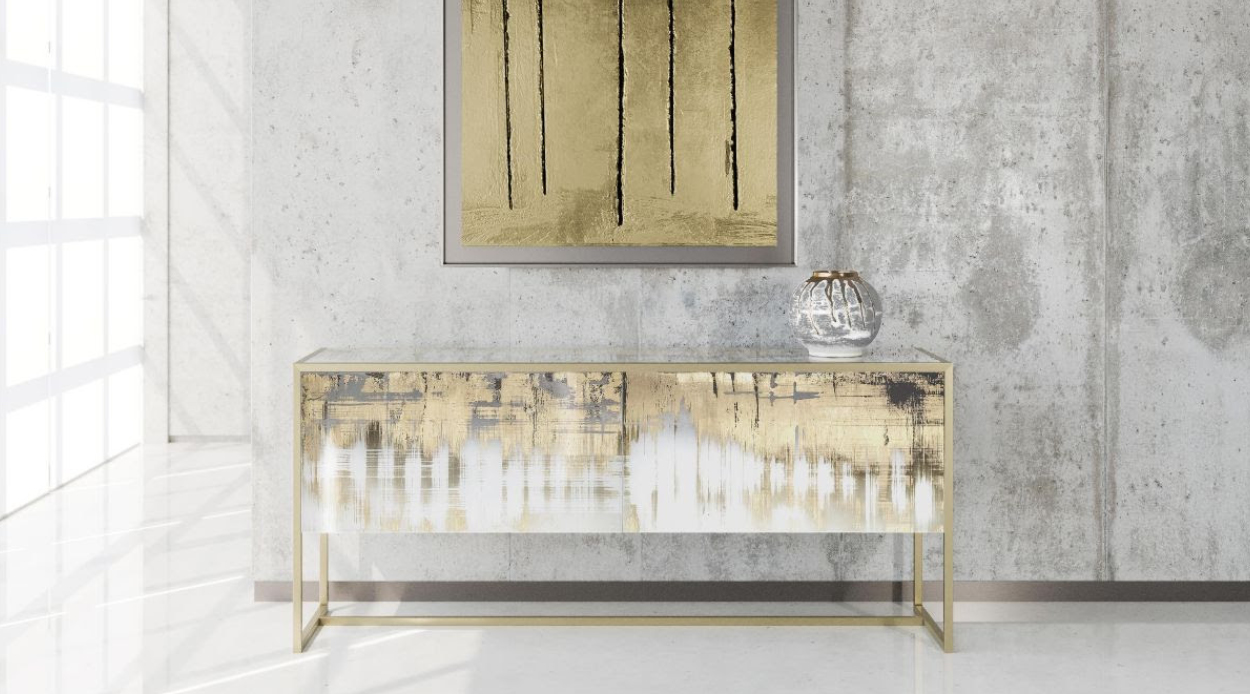 The piece, crafted by Italian furniture atelier Arte Veneziana, is inspired by the quaint town of Concordia Saggittaria in Venice, and is the epitome of dazzling Italian design. Fashioned from extra-clear glass, that’s been partially mirrored with antiqued finishing, and featuring a robust metal structure, the sideboard is at once elegant and luxurious, with an entirely unique aesthetic. The glass is elevated by the addition of hand-applied gold leaf decoration, which sits alongside shades of white colouring, rendering the standard furnishing a glistening work of art.