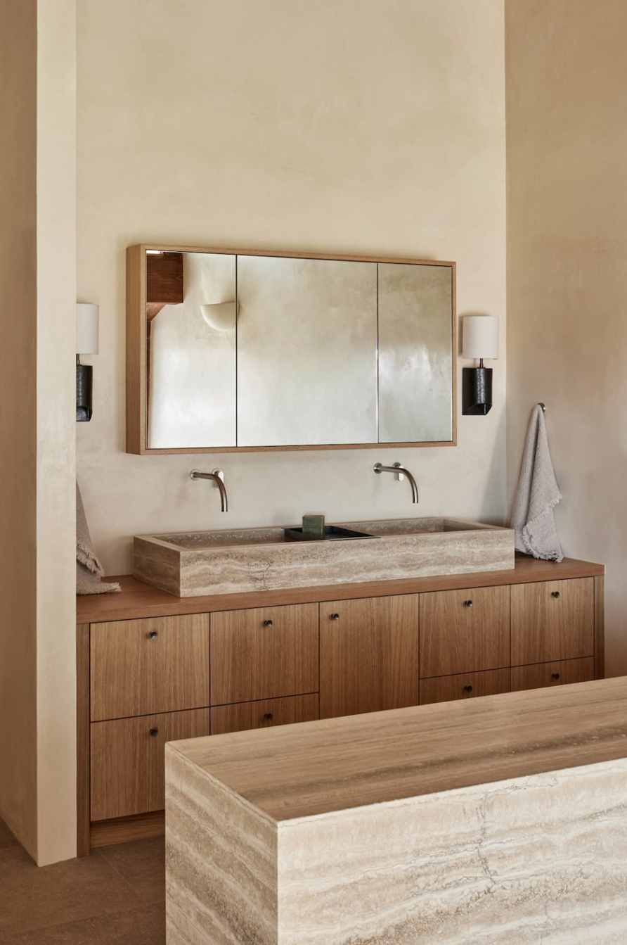 When introducing a statement stone to your home, benches are no longer the benchmark. Travertine, the stone of the moment, is particularly at home in the bathroom, bringing quiet luxury to sculptural basins, monolithic vanities, and even rendering entire rooms for a look that’s both luxe and enduring.