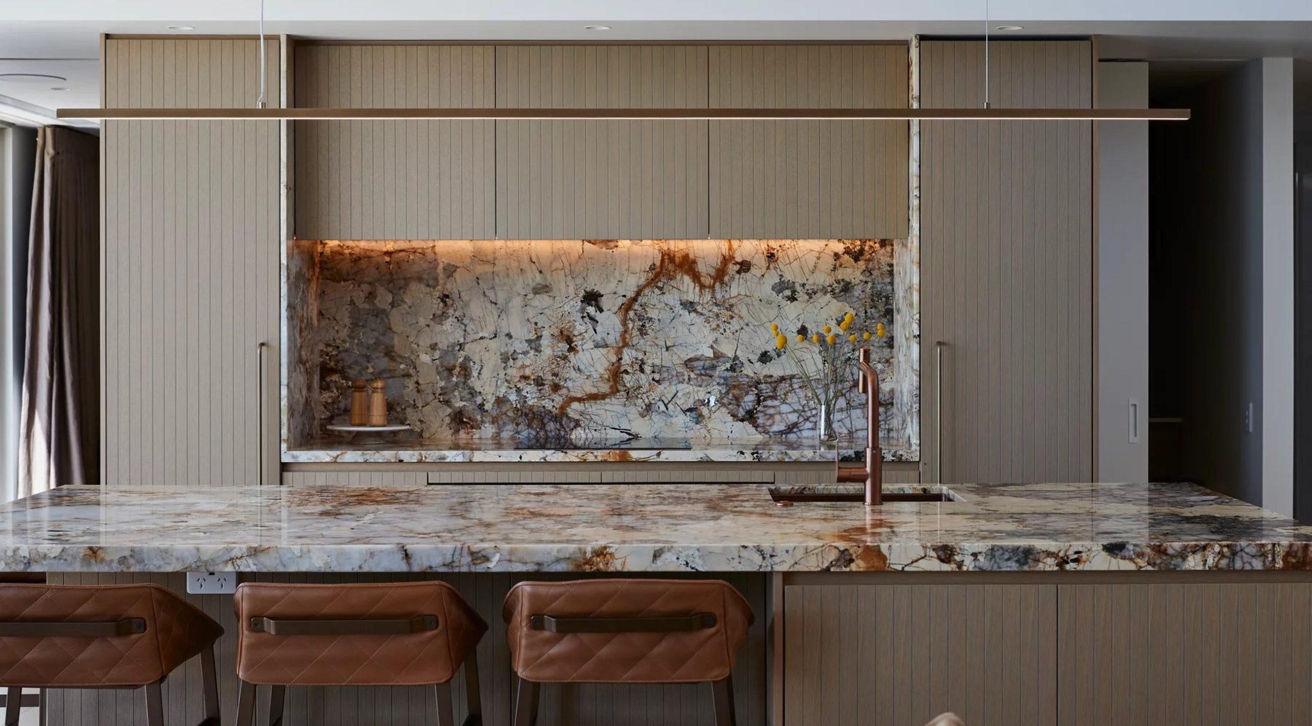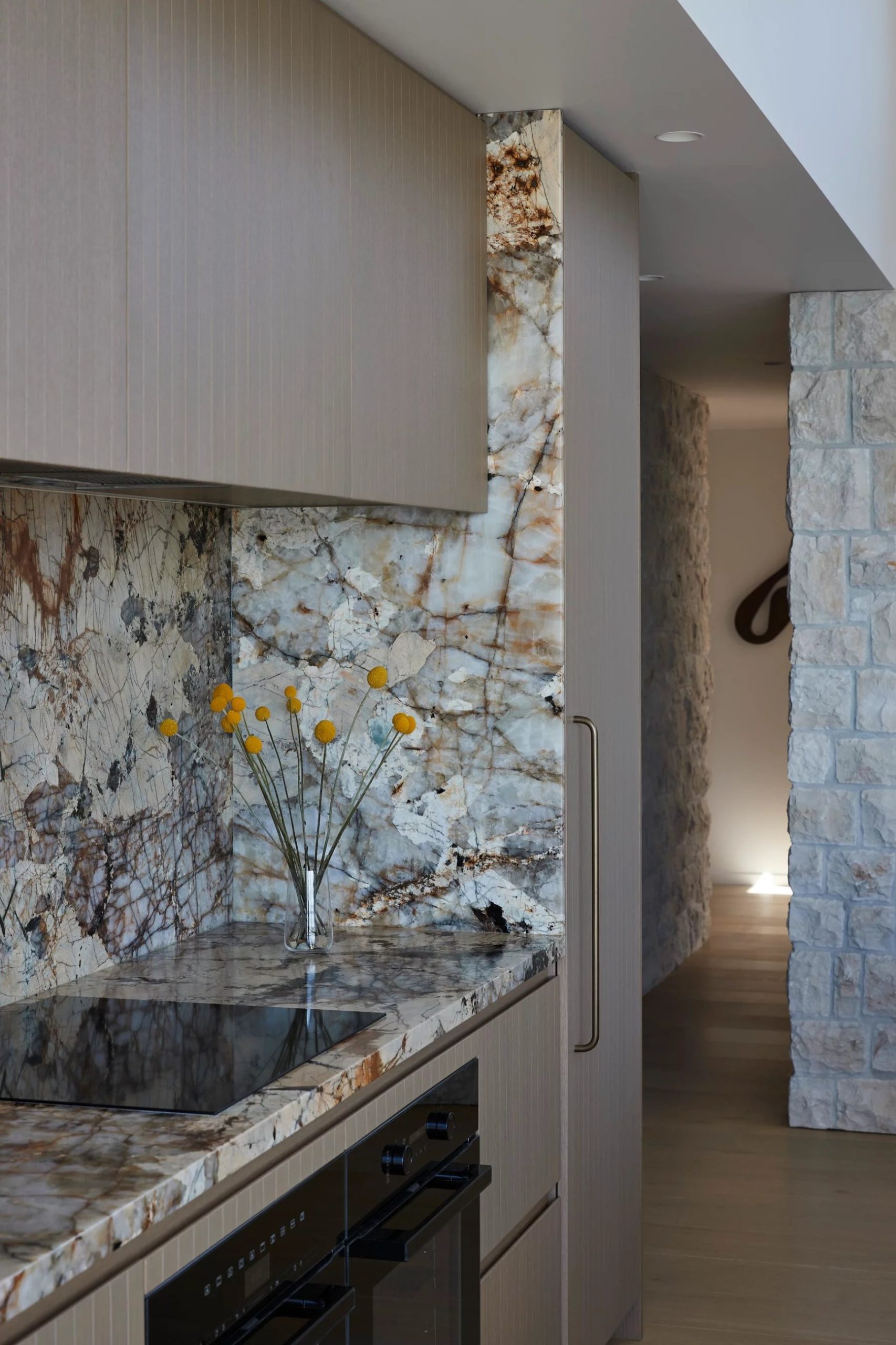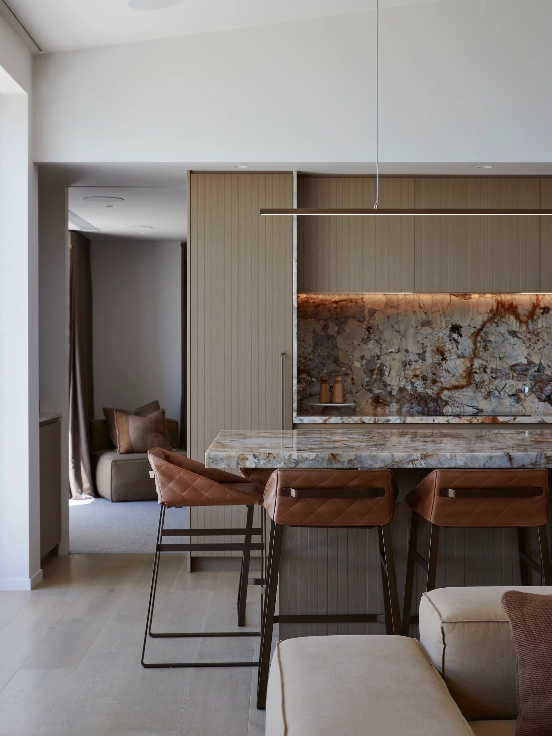 Inside, the palette does its work without raising its voice. Sandy stone tones run through the interiors, grounded and durable rather than decorative, paired with warm timbers and the kind of deft joinery that rewards a second look. Cabinetry is fitted with Powersurge’s Entrada Round Bar Handle and Beam Handle, discreet, well-weighted, the sort of detail you register with your hand before your eye.