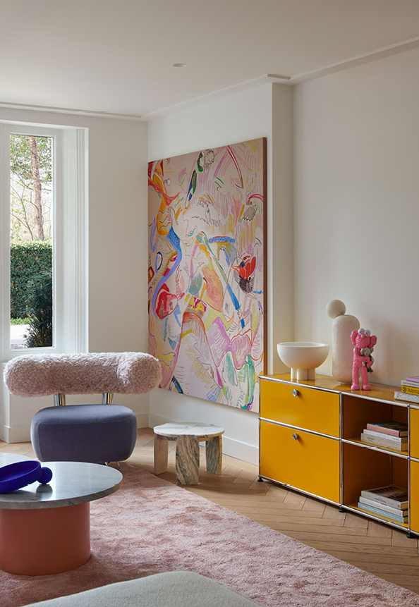 One such space is the music room, which sits as a sanctuary for relaxation and unwinding. An impressive record collection acts as a focal point, housed in two vintage bookcases by Vittorio Introini, while a meticulously crafted leather dresser adorned with exquisite details and a vintage Camaleonda sofa transformed with striking Dedar fabric elevate the space. With a harmonious blend of neutral textures, vibrant accents, and finely crafted (and carefully selected) furniture pieces sourced from Europe, the UK, and the US, this room is a stunning representation of its inhabitant’s love for exploration.