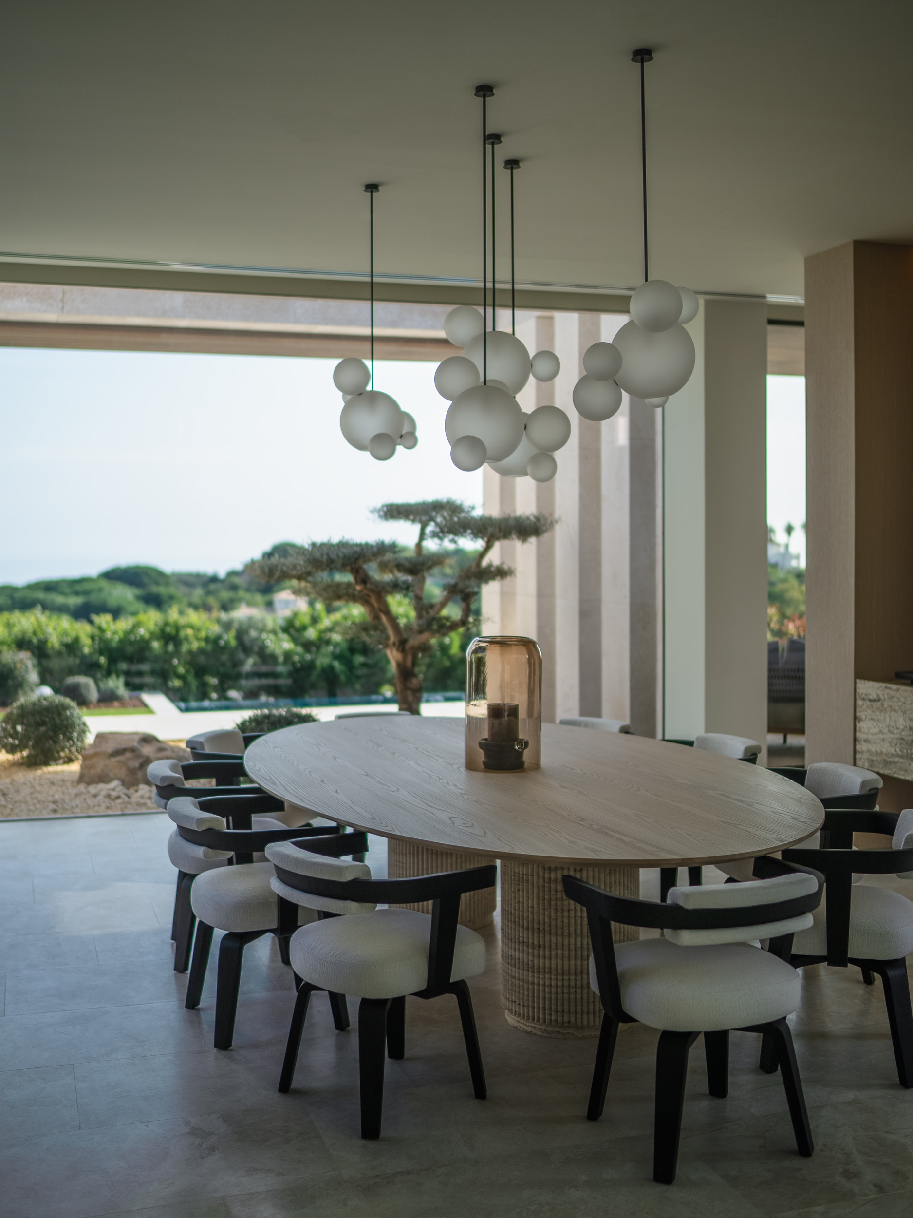 It is within this architectural framework that Molteni&C’s furnishings take on a defining role. Carefully curated across each space, the selection reinforces the villa’s dialogue between modernity and timelessness. In living areas, Vincent Van Duysen’s Marteen sofa and Cinnamon armchair by Naoto Fukasawa anchor rooms with warmth, their sculptural forms softened by tactile upholstery. The Porta Volta armchair by Herzog & de Meuron introduces a sharper contemporary accent in the dining room, while Gio Ponti’s D.151.4 armchair recalls the elegance of Italian modernism in a second leisure zone. A series of outdoor terraces continue this narrative, with Yabu Pushelberg’s Sway sofa and Van Duysen’s Cobea dining chairs setting an inviting tone.
