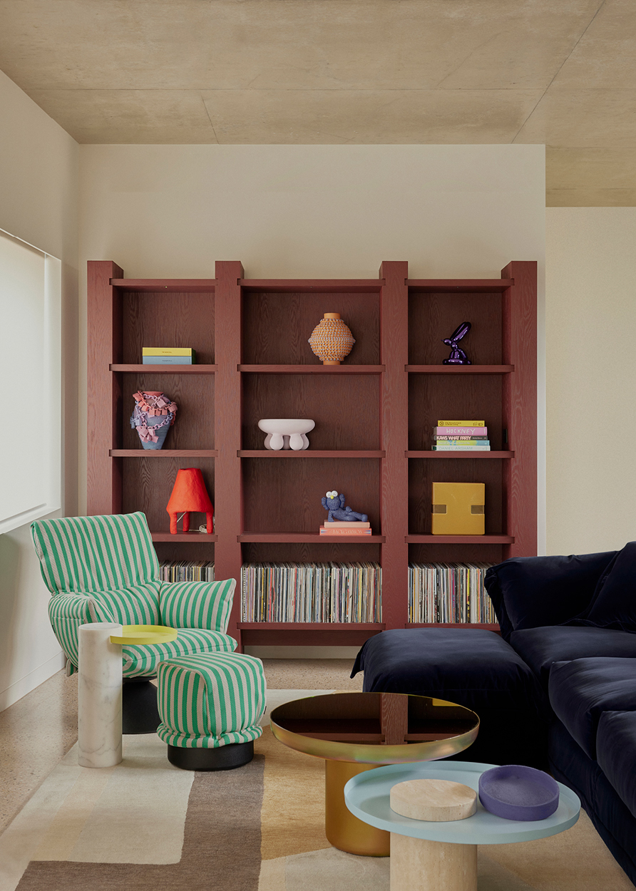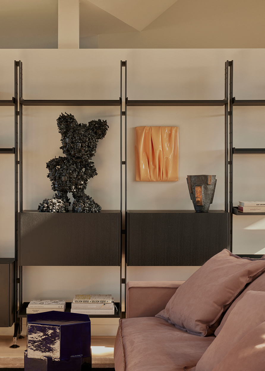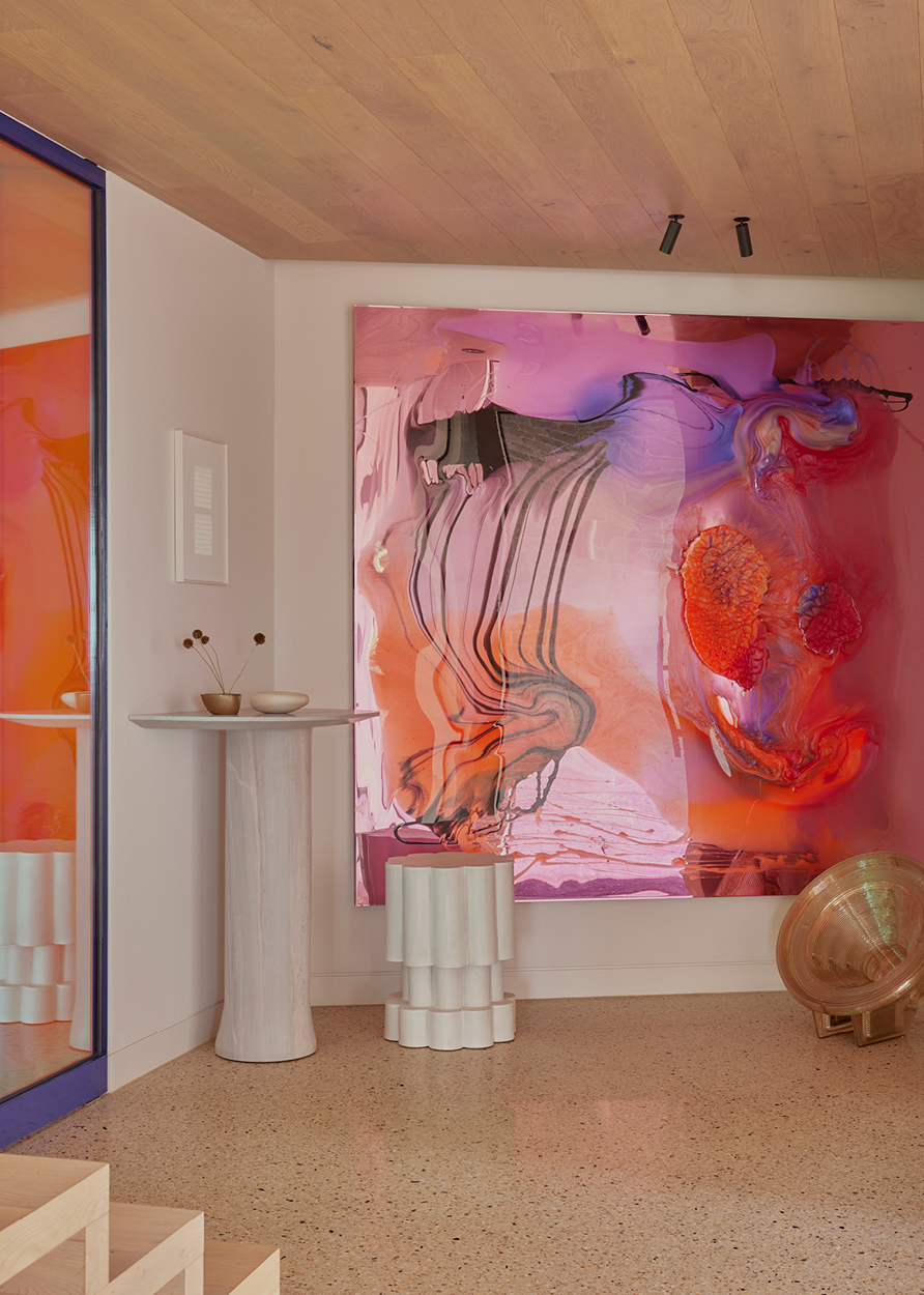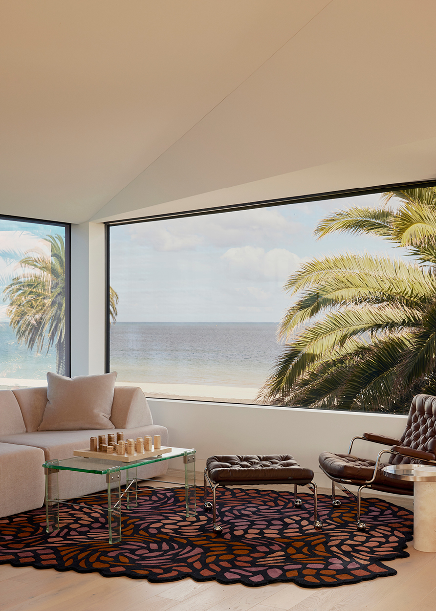 Custom pieces by the designer’s own studio decorate all three floors — leather-clad or hammered in bronze — in keeping with Knibbs’ own design sensibility. A whimsical perspex artwork by Sydney-based Dale Frank, a sourced rug by California core Kelly Wearstler and a tattooed credenza by Tyler Hays of American design studio BDDW all feel ultimately at home in a space that finely balances coastal calm, creativity and craftsmanship.
