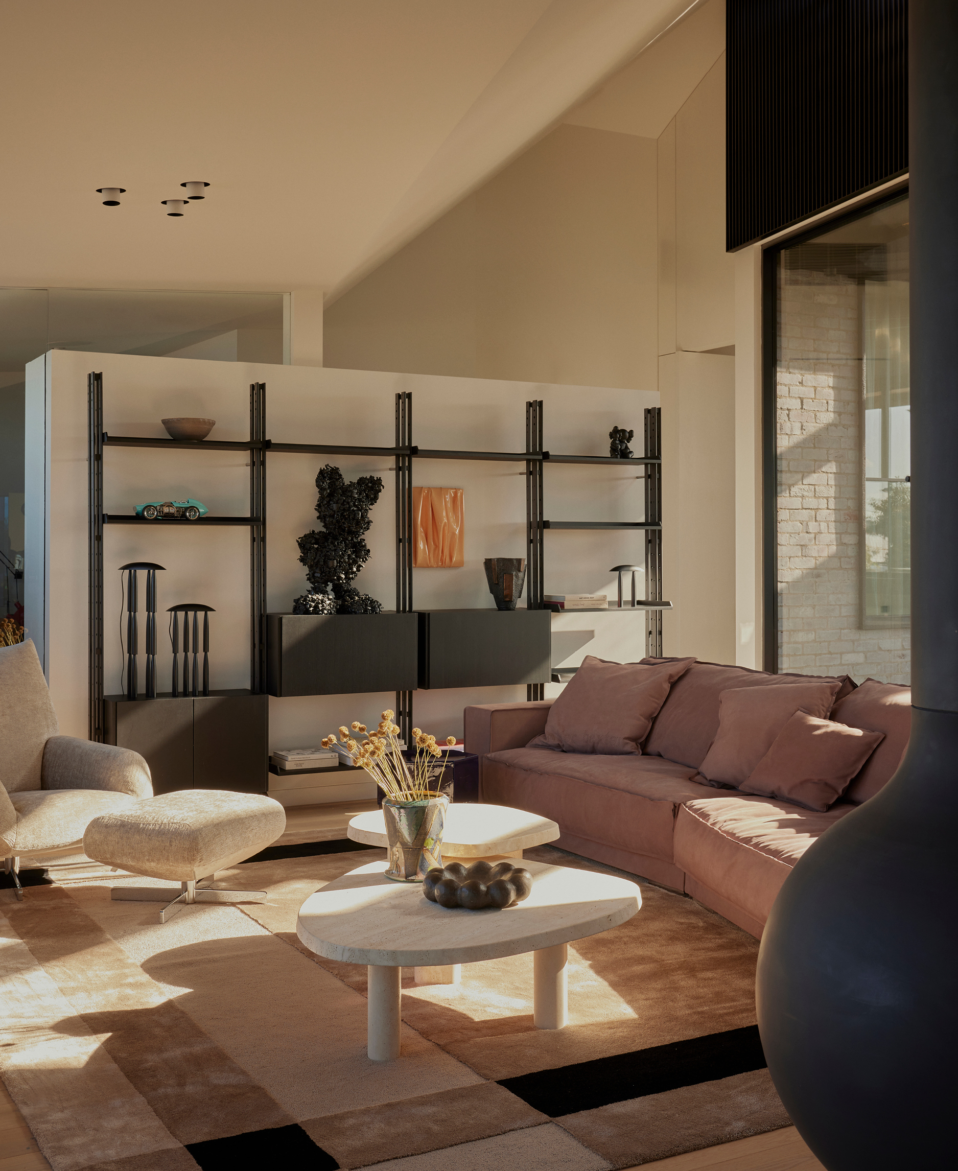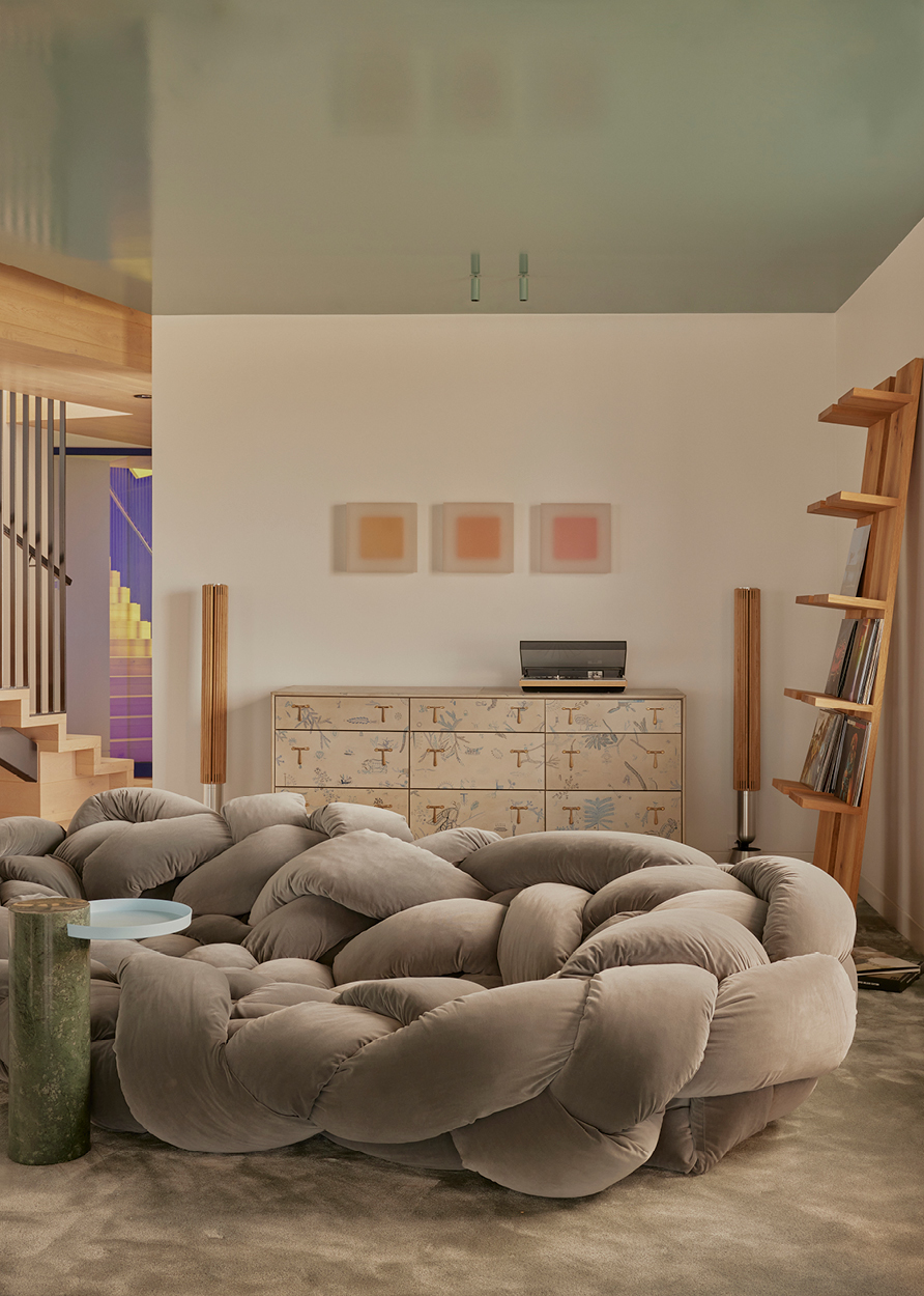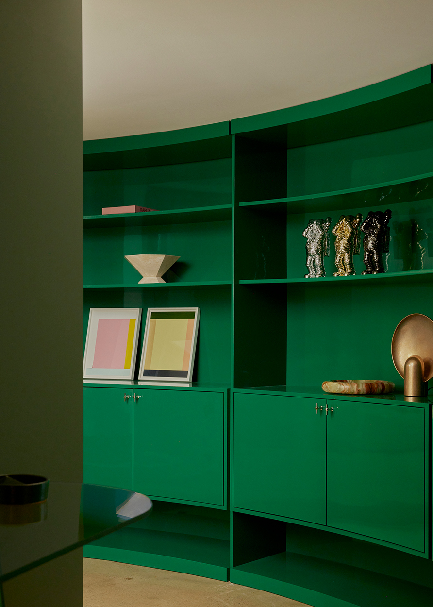 Custom pieces by the designer’s own studio decorate all three floors — leather-clad or hammered in bronze — in keeping with Knibbs’ own design sensibility. A whimsical perspex artwork by Sydney-based Dale Frank, a sourced rug by California core Kelly Wearstler and a tattooed credenza by Tyler Hays of American design studio BDDW all feel ultimately at home in a space that finely balances coastal calm, creativity and craftsmanship.