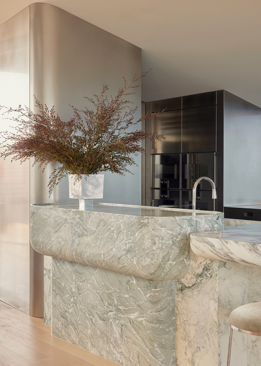 In the kitchen, Knibbs reoriented the focal point to face the bay. The space, now anchored by a monastic kitchen island hand-crafted from solid blocks of Arebescato, Brescia Green and Menta marble, speaks to both the designer’s penchant for natural stone and the necessity of modern family living. The stainless steel cabinetry is finished with bronze pulls, adding both artistry and warmth.