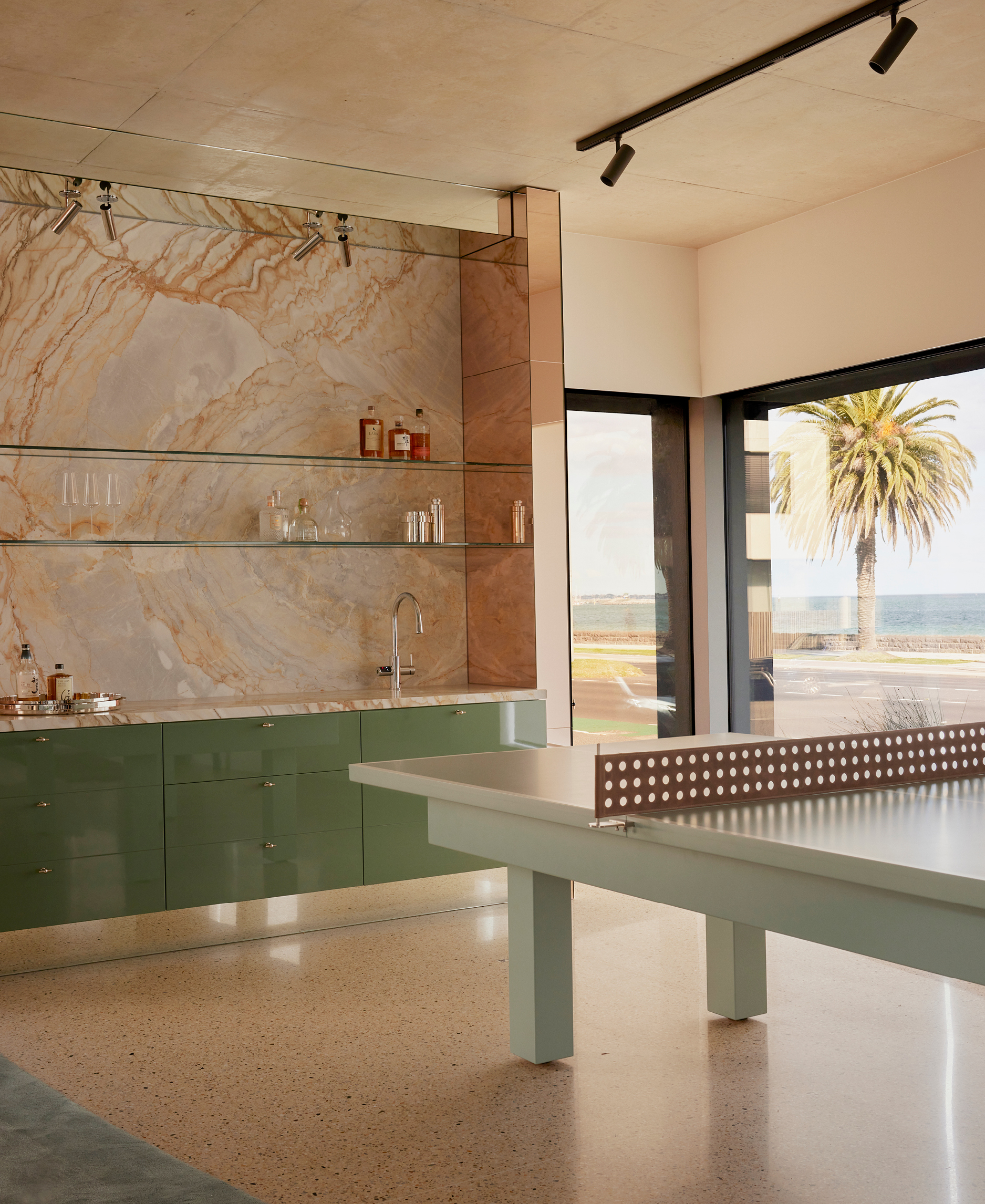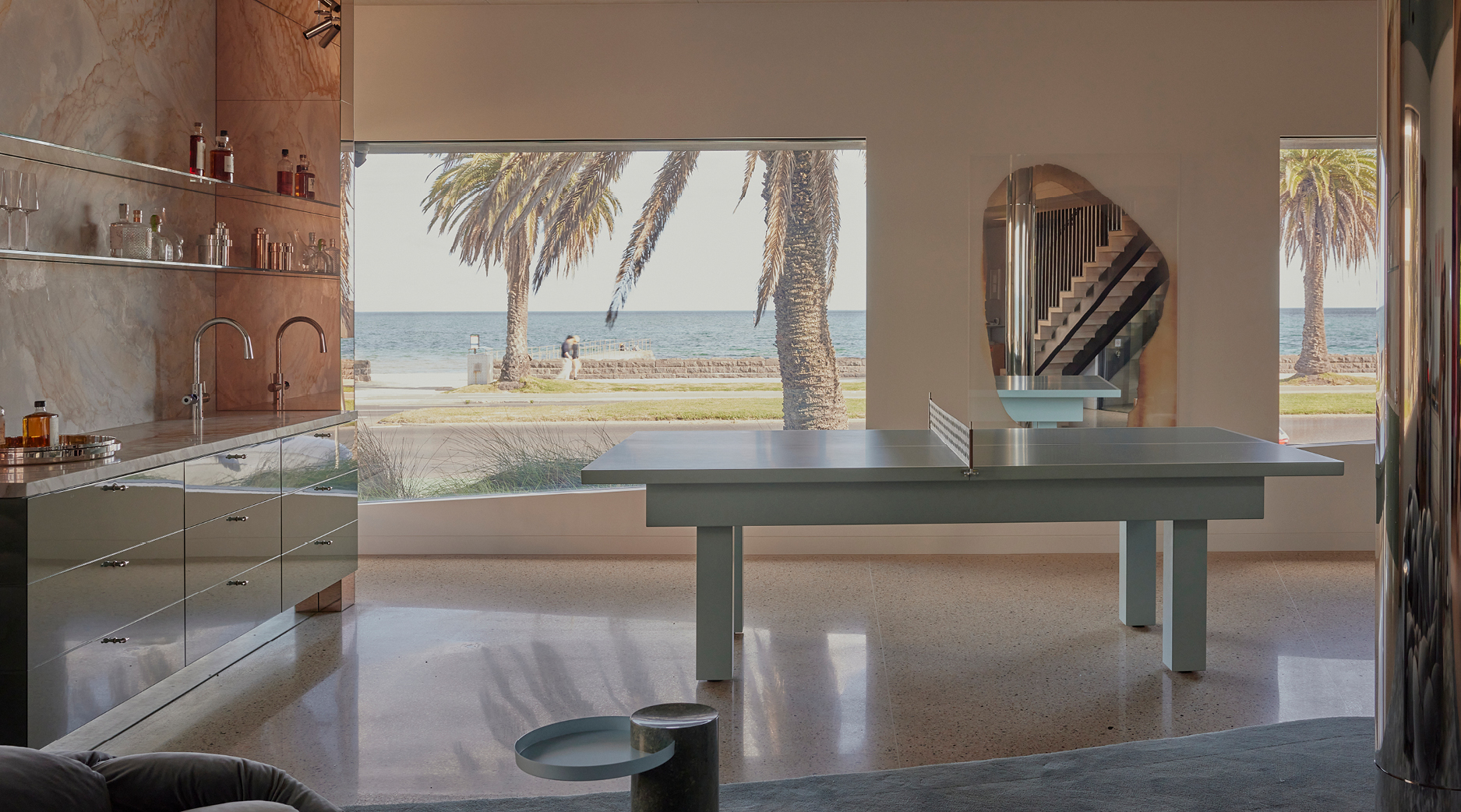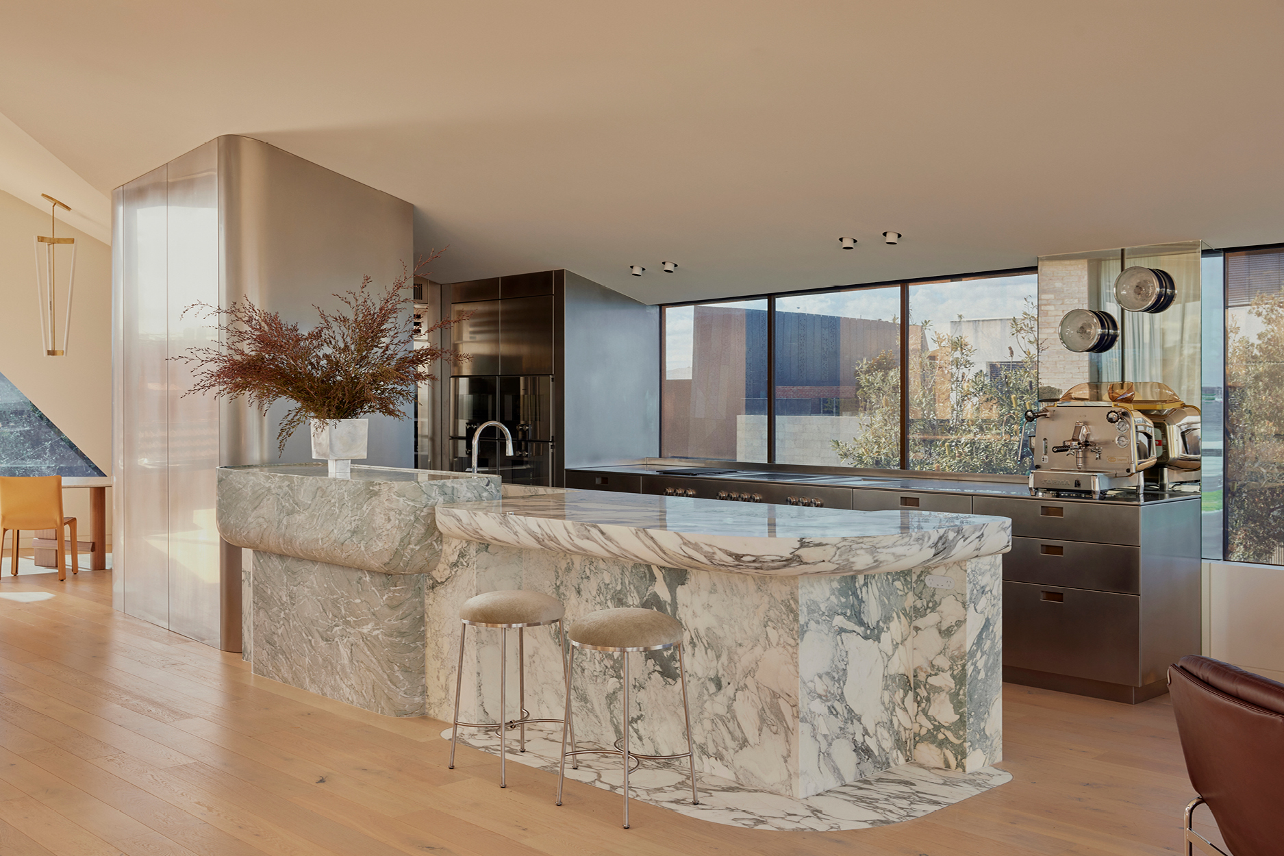 The result? A masterclass in nuanced, natural materials (think sheets of warped stainless and solid blocks of green veined marble) all while ushering in the coastline.