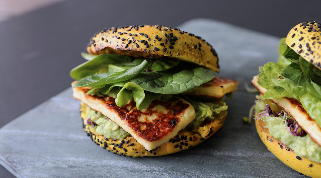 5. To serve, spread the avocado on the bottom half of the bagel and sprinkle a handful of herbs before placing the halloumi on top. Finish with lettuce and put the top half of the bagel on to complete the dish. Devour.
