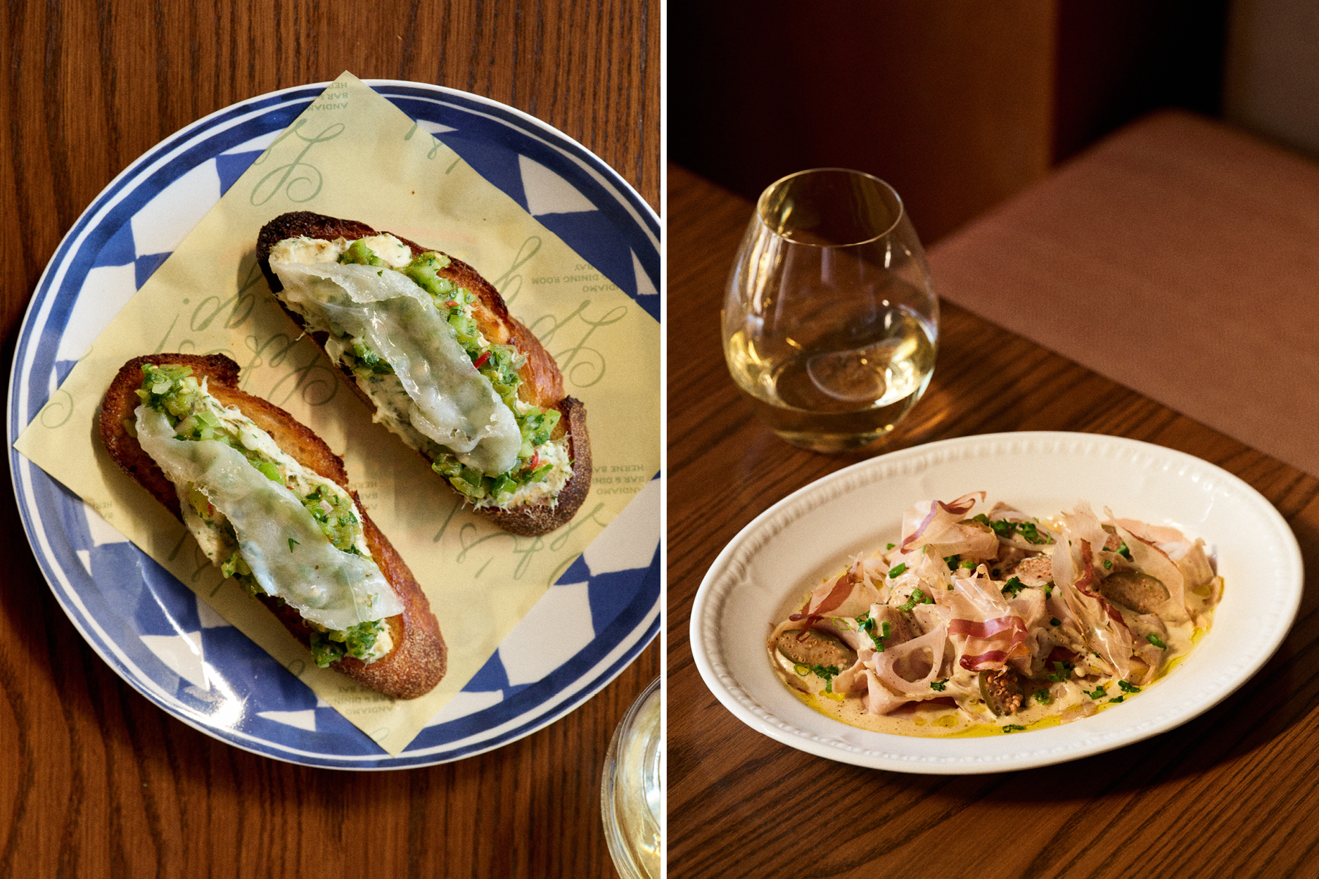 left: Bruschetta with smoked fish, green tomato, capers and lardo. Right: Vitello Tonnato with rose veal, tuna mayo and caperberry
