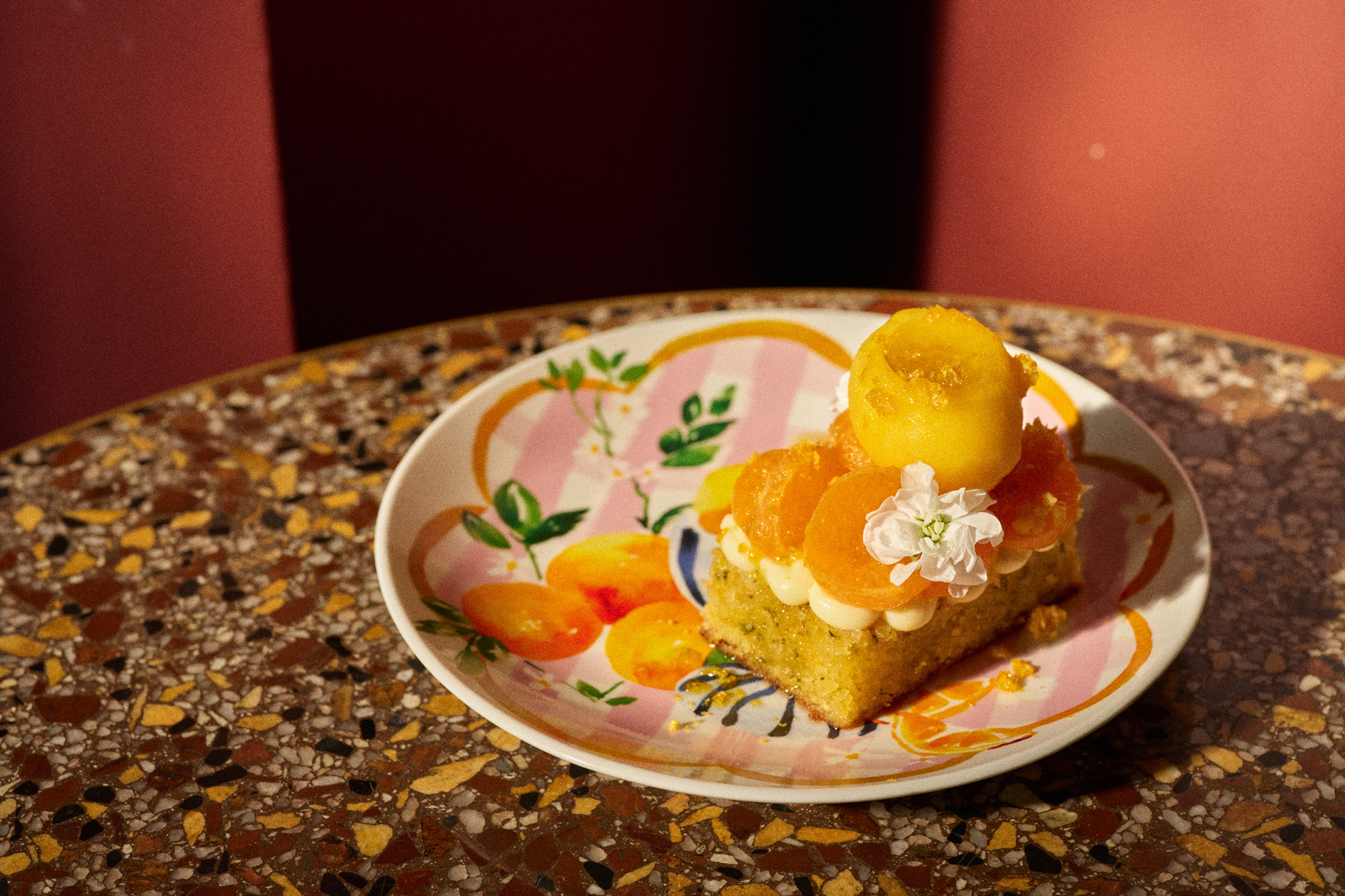 Olive Oil Cake with mandarin, whipped ricotta and mandarin sorbet