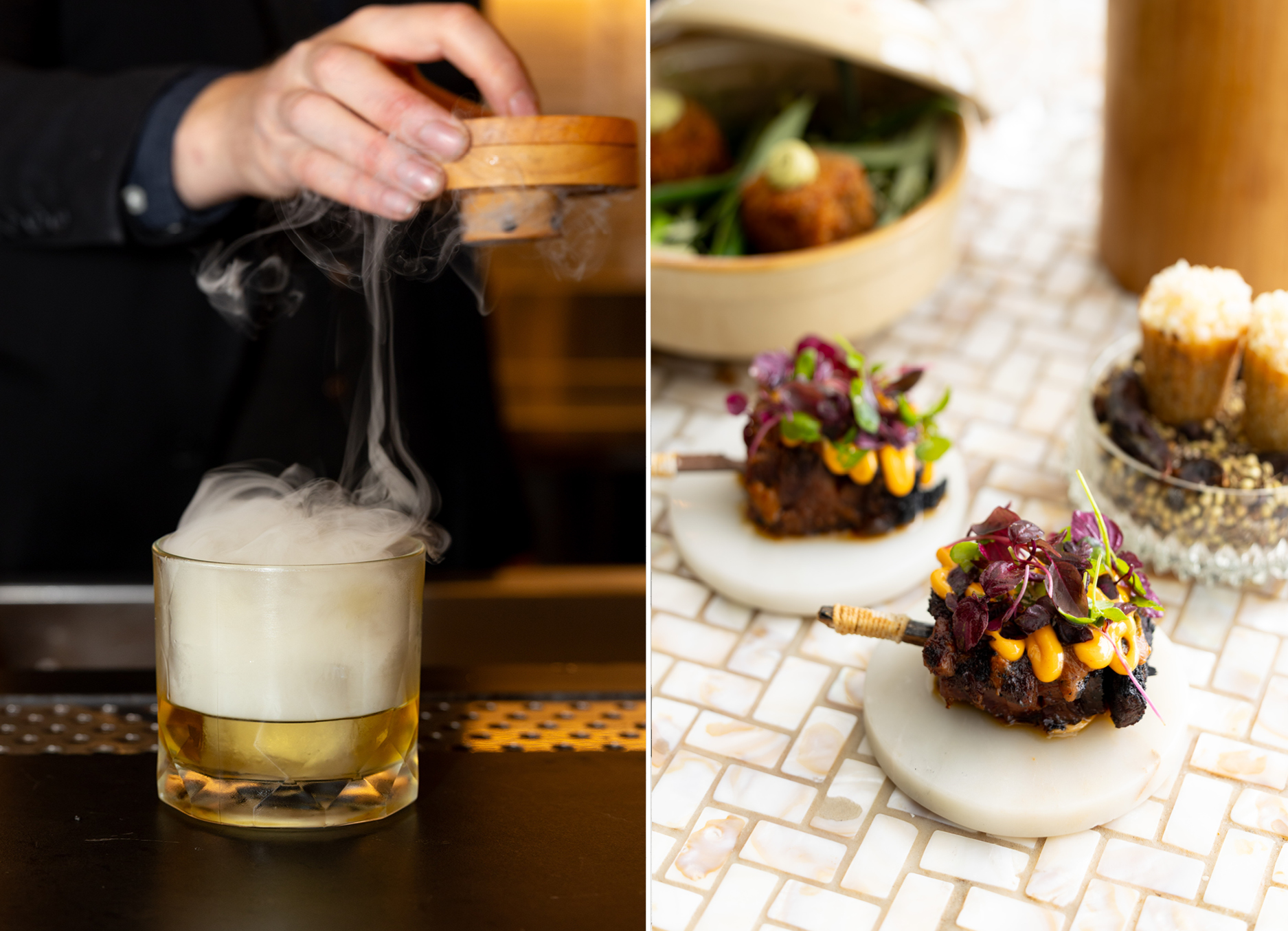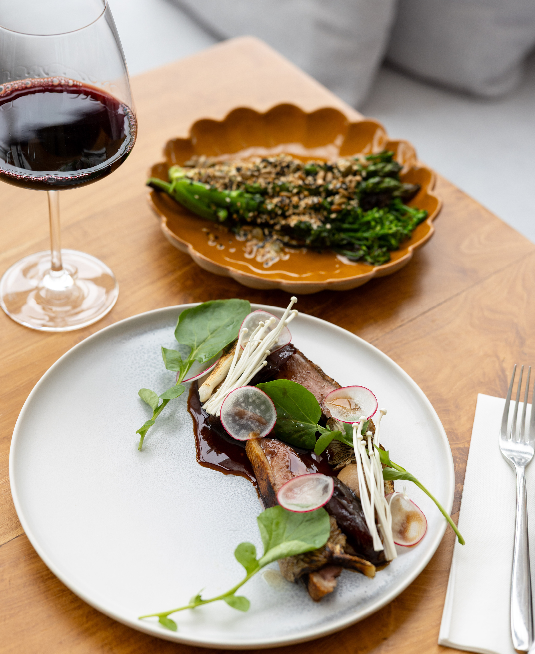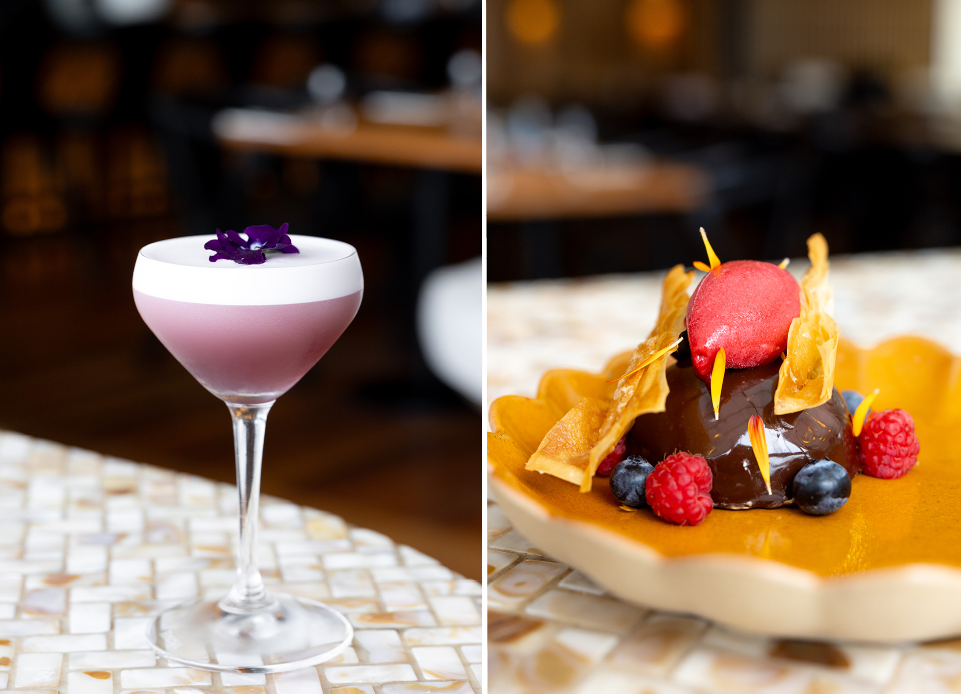 Entrees range from a reimagined caprese — heirloom tomatoes with buffalo curd and basil — to bold game, such as wild venison with watercress raita and macadamia. Mouthwatering mains set the table for family-style feasts: saffron tagliatelle with tomatoes, parsley, chilli oil, and prawns; market fish with burnt-leek butter; harissa-roasted chicken; marinated lamb loin; and dry-aged duck breast with earthy oyster mushrooms, dates, marmite and cashew cream — a sweet and salty symphony.