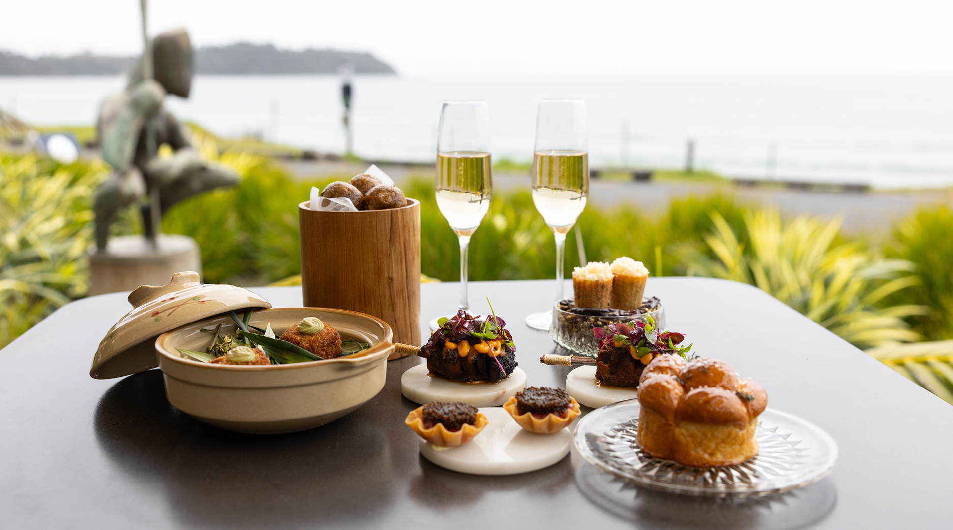 Seafood lovers can indulge at Ki Māha’s renowned raw bar, then savour creations like tuna crudo with radish, sea grapes, and chilli-verjus dressing. Shareable snacks abound, from scallop ceviche in coconut dressing that sings with Southeast Asian flavours to goat’s cheese fritters drizzled with hot honey, lemon, and thyme. Pair these delights with a glass of Cloudy Bay Perolus Sparkling and let the afternoon drift by with the ebb and flow of Onetangi’s shoreline.
