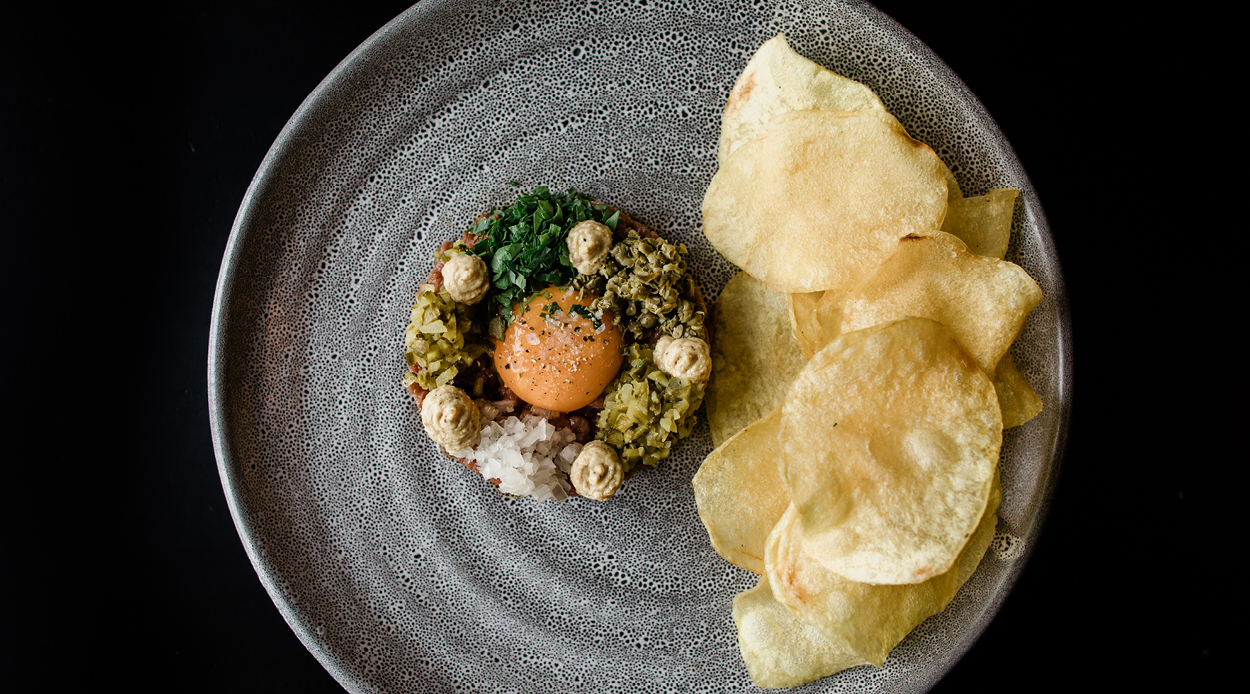 A classic combination of raw yolk, minced onion, hot sauce and mustard makes this beef tartare utterly delicious, especially when transported hand-to-mouth on crunchy house-made crisps.