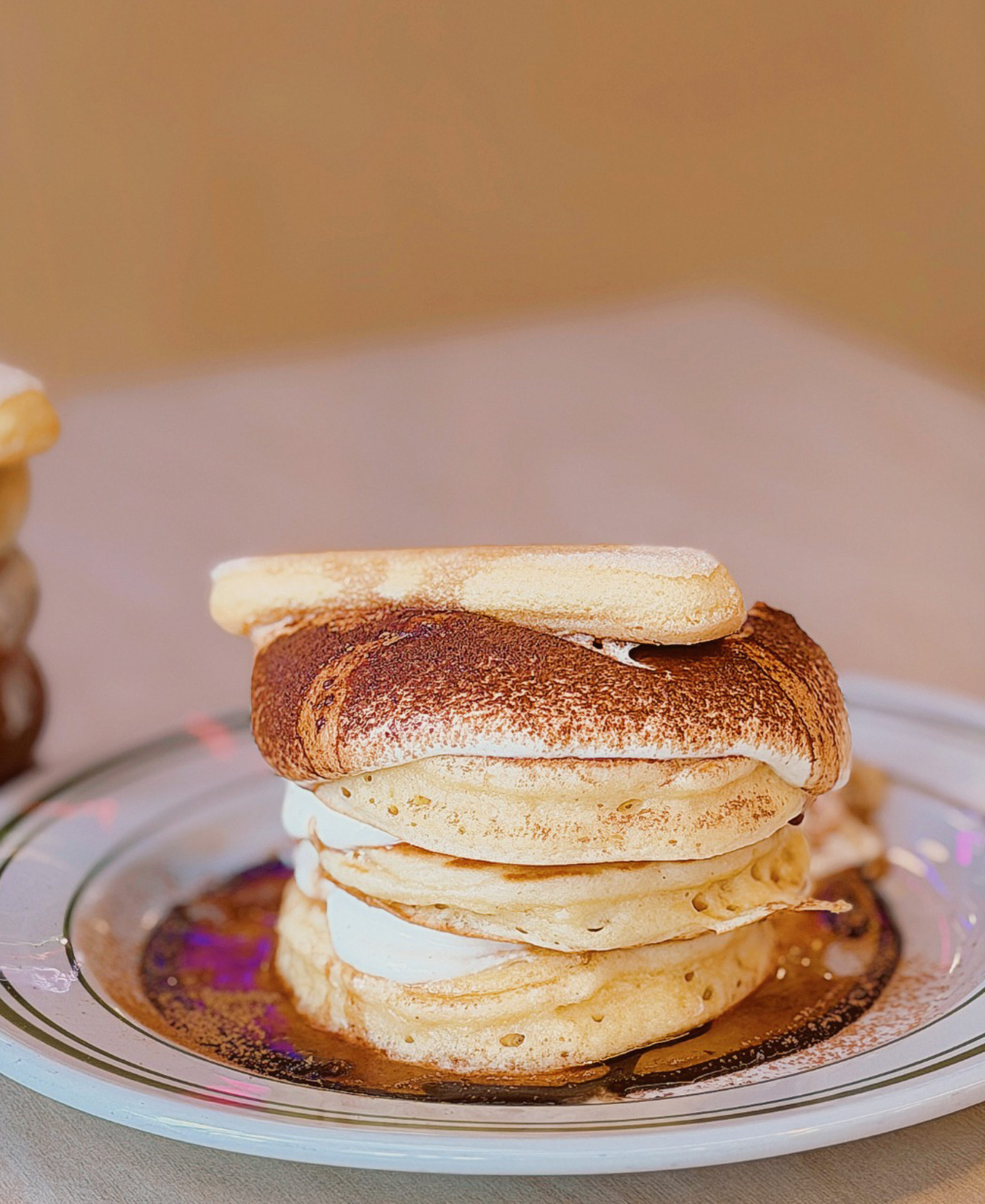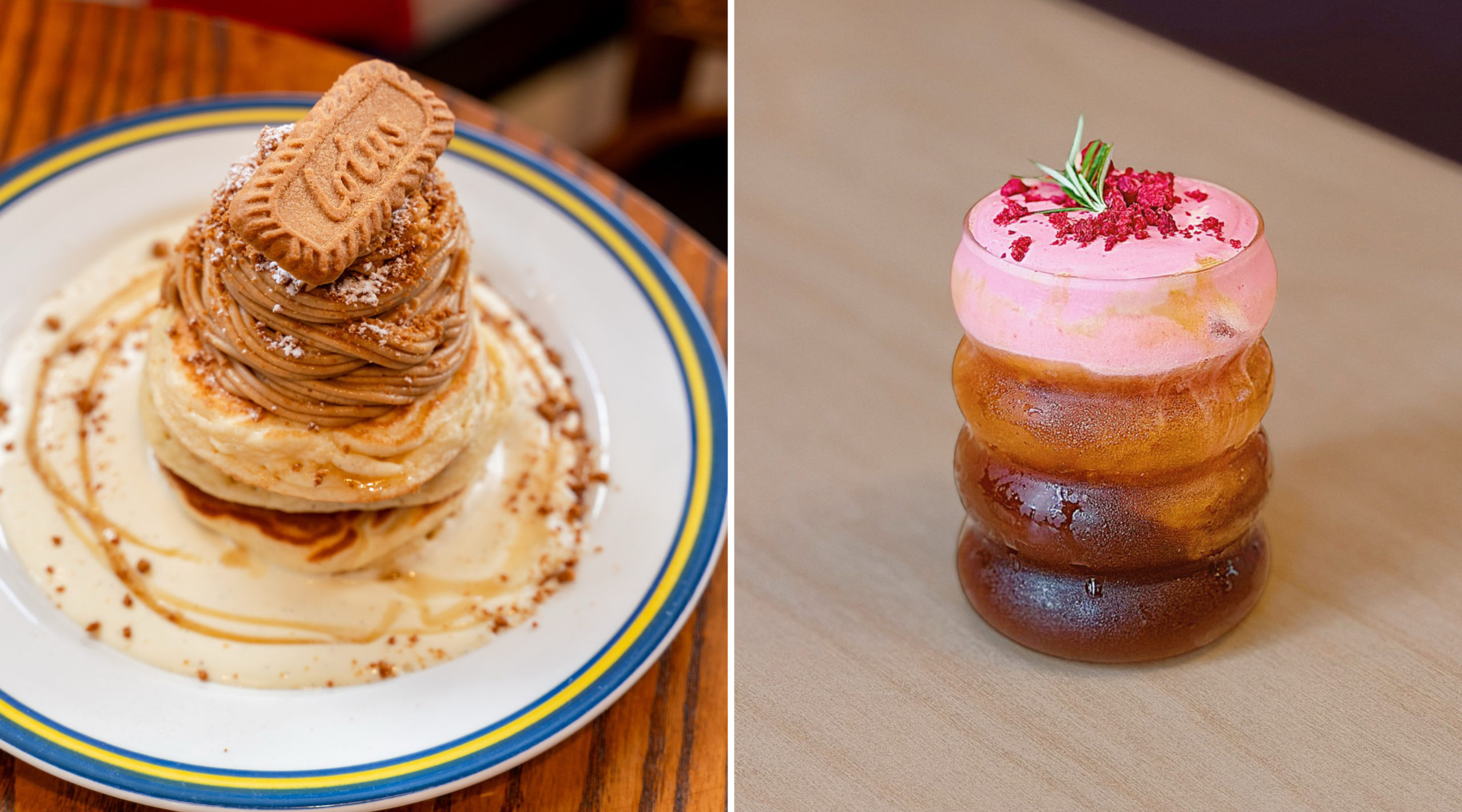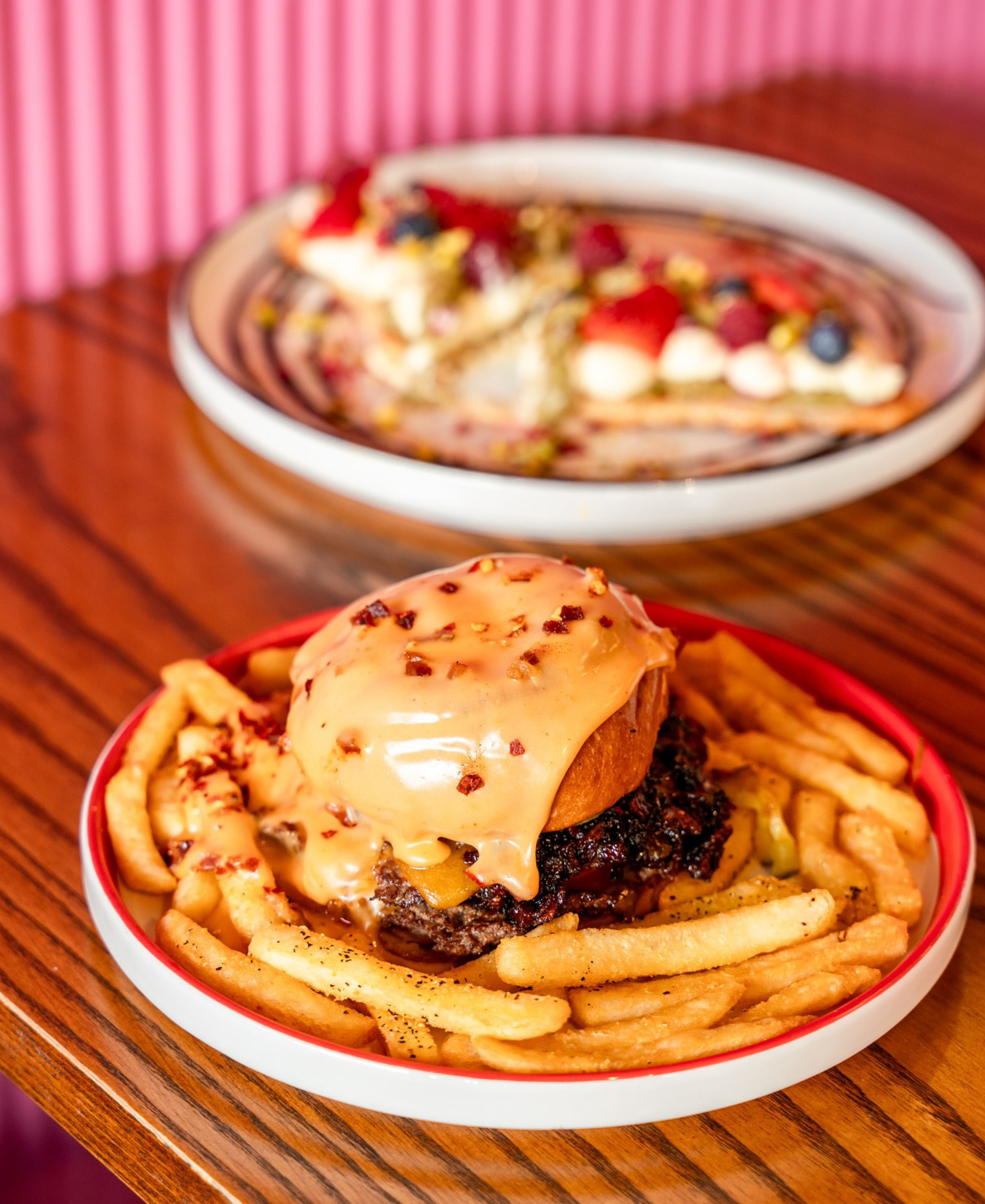 Here, the pancakes are the main event, with a full stage of theatrical characters. We’re talking triple-stacked buttermilk pancakes, presented in the most wildly indulgent way, loaded with Dubai chocolate, or layered with fruit loops and vanilla ice cream, Biscoff crumbs and mascarpone, each iteration unapologetically aiming to be the star of the show. And for those more inclined to the savoury side, the melt-down cheeseburger, stacked with crispy onion rings, spicy bacon jam and crinkle-cut fries, delivers in all the right ways, while the habanero fried chicken on a croffle, finished with house-made habanero maple syrup, walks the line between chaotic and completely convincing.