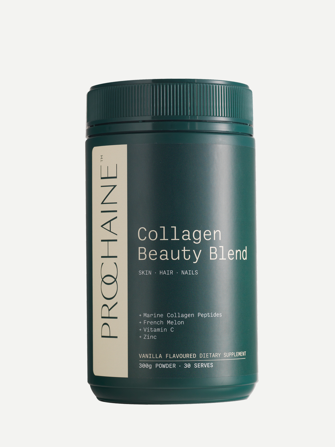 of collagen going in and collagen out. Filling up your collagen stores with collagen is necessary, especially as we age, but not as effective if you are not taking into account collagen ‘leaks’. And free radical damage is a major collagen leak. For Prochaine, we not only sourced a very high quality hydrolysed marine collagen powder for everyday supplementation, but paired this with Holimel® French melon concentrate, a powerful antioxidant that reduces collagen breakdown in the skin. This stuff is pretty special.